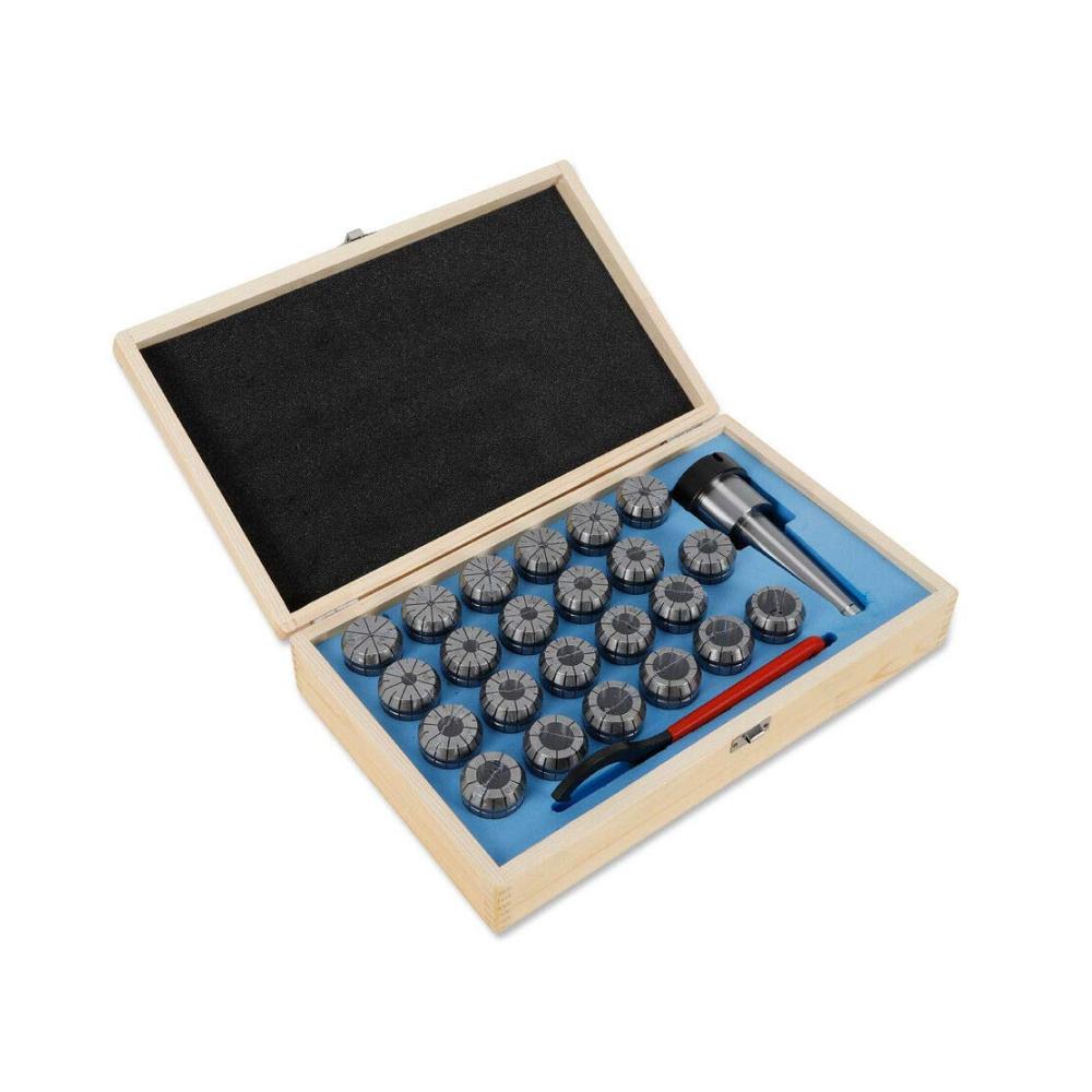 Die ER40 Spannzangen gewährleisten eine sichere und präzise Fixierung der Werkzeuge, während das mitgelieferte Futter mit MK4 M16 Anschluss eine einfache Montage ermöglicht. Das Set enthält zudem einen Schlüssel für eine bequeme Handhabung und eine hochwertige Holzbox zur sicheren Aufbewahrung.
