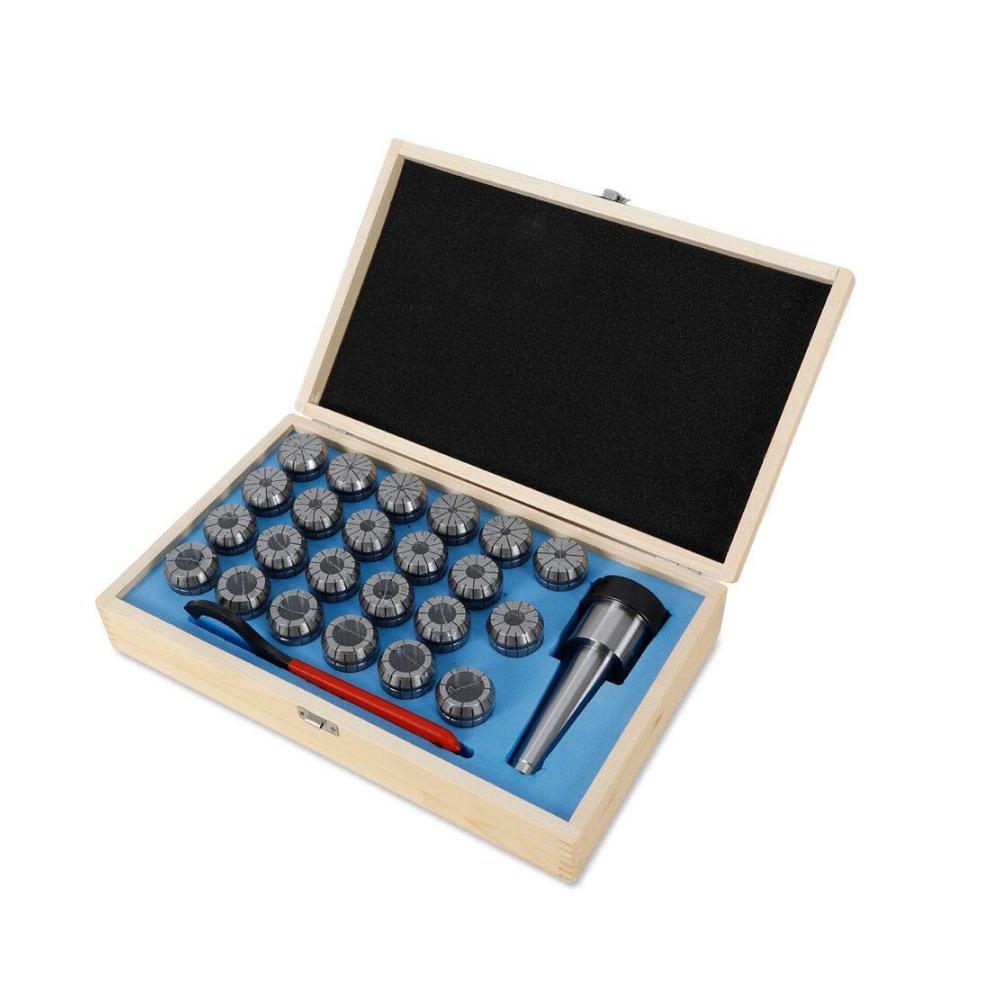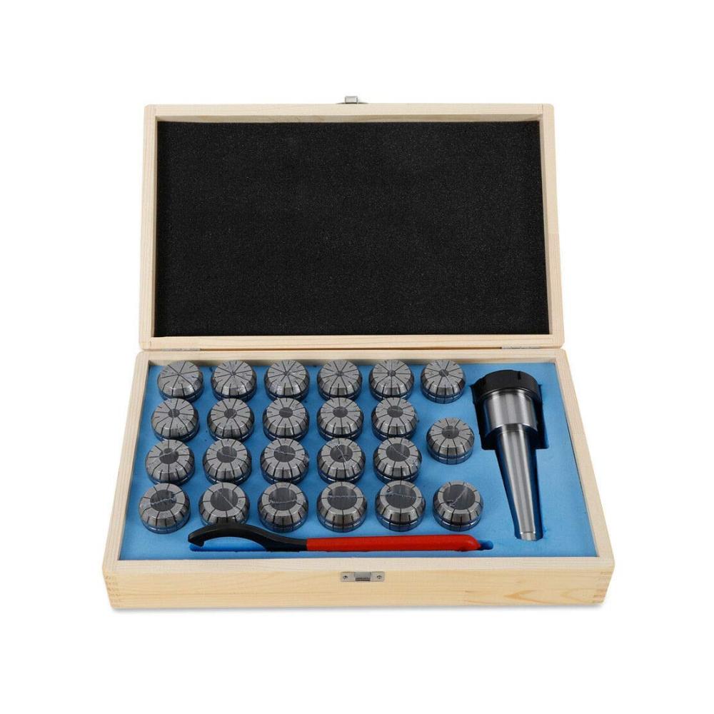 Packliste: ER40 Spannzangenset Ø 4 – 26 mm (23 Stück in 1mm Schritten) ER40 Spannzangenfutter MK4 mit M16 Anzugsgewinde ER40 Spannzangenmutter ER40 Schlüssel
