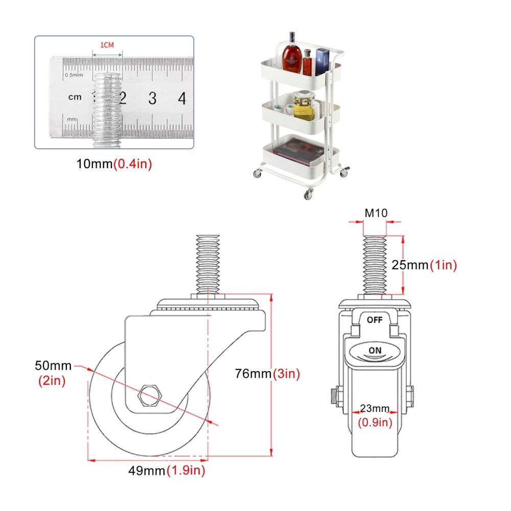 Produktname: Kleine MöbelrollenRaddurchmesser: 50 mm (detaillierte Abmessungen siehe Abbildung 2)Rollenbreite: 23 mmGewindestangengröße: M10x25mmDicke: 2 mmEinbauhöhe: 76mmKapazität: 45 kg pro RadDas Paket beinhaltet: 4 x Rollen mit GewindevorbauDie Räder bestehen aus weichem Gummi und TPE-Material, gleiten geräuschlos, verletzen den Boden nicht, haben eine hohe Elastizität und Haltbarkeit. for die meisten Bodenarten geeignet.Die Rollen verfügen über eingebaute Präzisionslager und sind auf beiden Seiten durch Staubkappen geschützt, um die Lebensdauer der Räder zu verlängern. Doppelschichtiges Schaftdesign, 360° flexible Lenkung, stabil. Darüber hinaus ist die Gewindebefestigung verchromt, schön und elegant, wasserdicht, staubdicht, kälte- und hitzebeständig; Es kann die Möbel bei Bedarf einfach und praktisch bewegen.Möbelrollen eignen sich perfekt for den Innen- und Außenbereich. Bewegliche Rollen können in Häusern, auf Rasenflächen, in Fabriken, Geschäften, Betrieben und Krankenhäusern eingesetzt werden. Ideale Rollen for Möbel und andere kleine bewegliche Möbel wie Couchtische, Schreibtische, Bücherregale, Schuhschränke, Einkaufswagen, Gepäckstücke, Trolleys.*Hinweis: Jede Rolle hat eine Tragfähigkeit von 45 kg und die Gesamttragfähigkeit aller 4 Rollen beträgt 135 kg (berechnet als 3 Rollen). Da die Fahrbahn uneben ist, tragen manchmal nur drei Rollen das Gewicht.?Vorsichtsmaßnahmen?1. Die Produktfarbe kann aufgrund unterschiedlicher Beleuchtungs- und Auflösungseinstellungen geringfügig vom Bild abweichen. Bitte beziehen Sie sich auf die tatsächliche Farbe.2. Bitte erlauben Sie aufgrund des Unterschieds bei der manuellen Messung einen Größenunterschied von ± 1 mm. Danke for dein Verständnis.