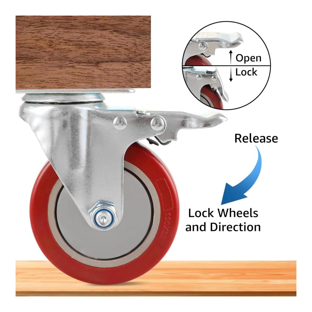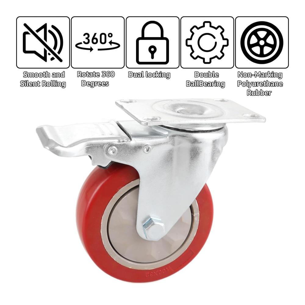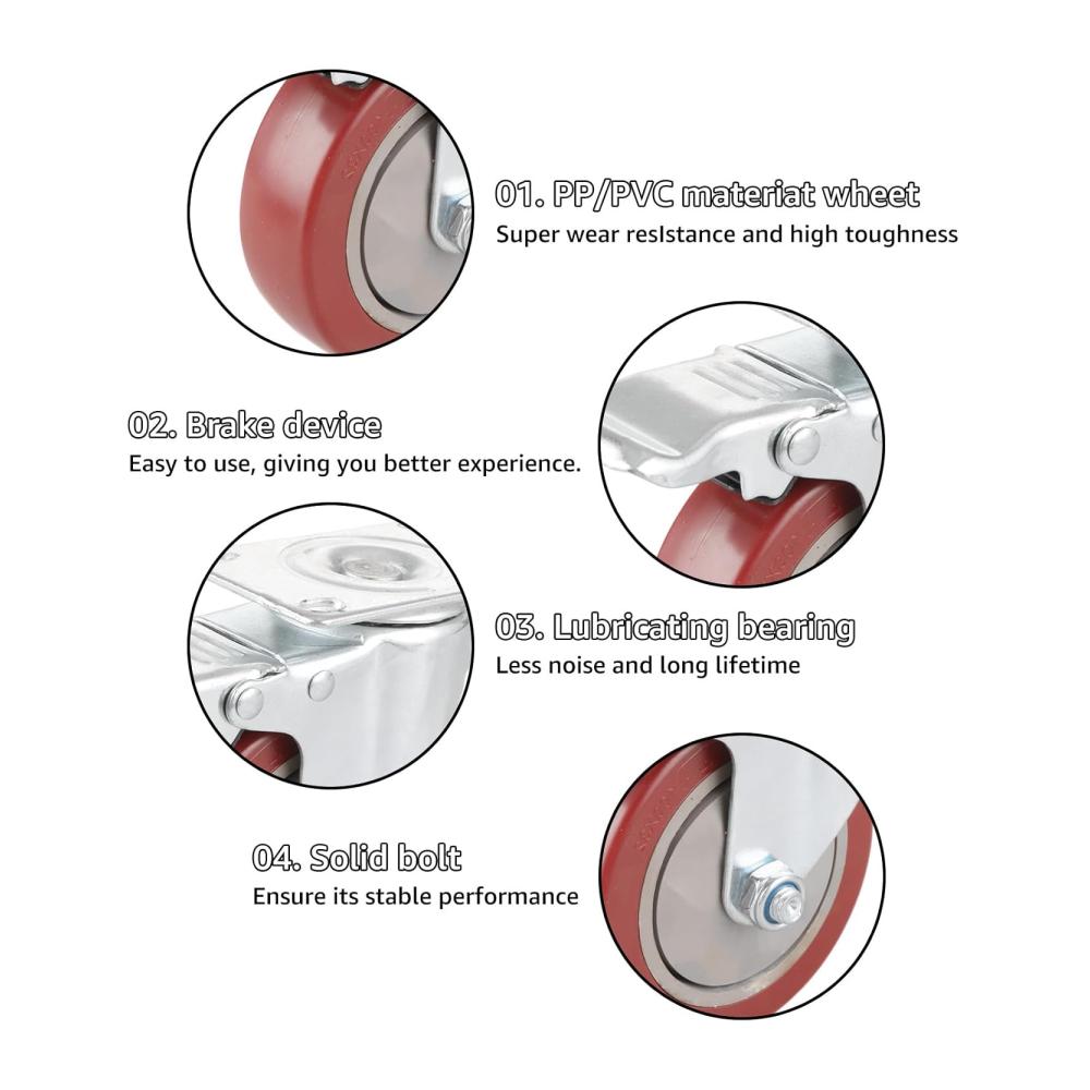 Merkmal: 1.Hochwertiges Material- Die Schwerlastrollen sind mit Polyurethan-Gummi beschichtet, um eine reibungslose Fahrt zu gewährleisten und Stöße und Vibrationen zu absorbieren. Kugellager und doppelte Verriegelungsschnallen bringen maximale Gewichtskapazität und Sicherheit. Polyurethan (PU)-Rollen haben die Flexibilität von Gummirädern und die Robustheit und Haltbarkeit von Metallrädern. 2.Praktisches Design- Das Lenkrollen mit Möbel Bremse ist um 360 Grad schwenkbar und ermöglicht eine Drehung auf Augenhöhe. Ideal für das Bewegen von leichten Möbeln und Displays, sie sind sowohl leise als auch sicher. Die glatte Oberfläche der Rollen wird nicht mit Haaren, Schutt und Staub stecken bleiben. Rollen mit Bremsen sind für alle Bodenarten geeignet. 3.Breite Anwendung-schwerlastrollen mit bremse können für eine Vielzahl von Anwendungen verwendet werden, wie z. B. Flightcases, Instrumentenkoffer, Ausstellungs-/Ausstellungsgeräte, Wagen, Werkzeugkästen, leichte Maschinen, Geräteregale, mobile Arbeitsplätze, Lautsprecher, Schränke, Ständer, Verstärker, Gerätegehäuse, Möbel und mehr.