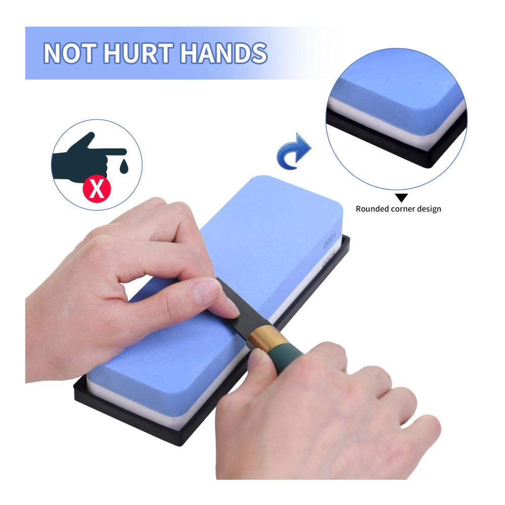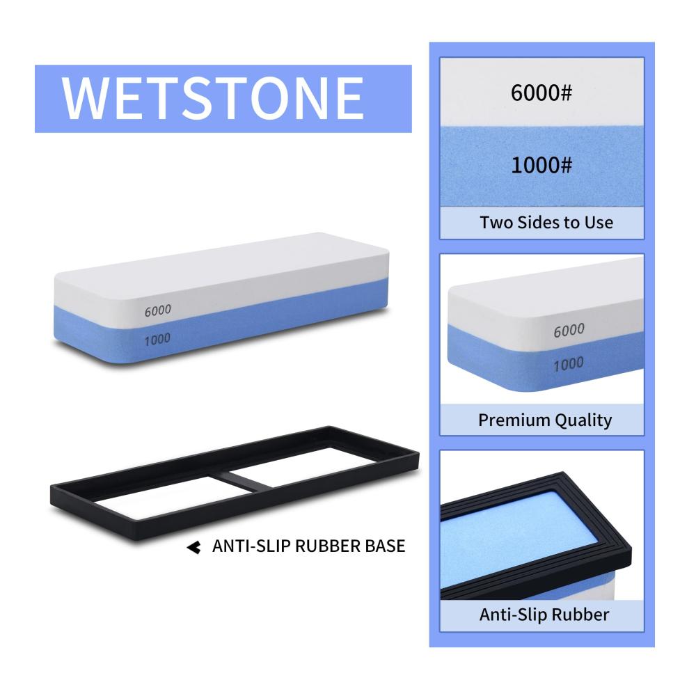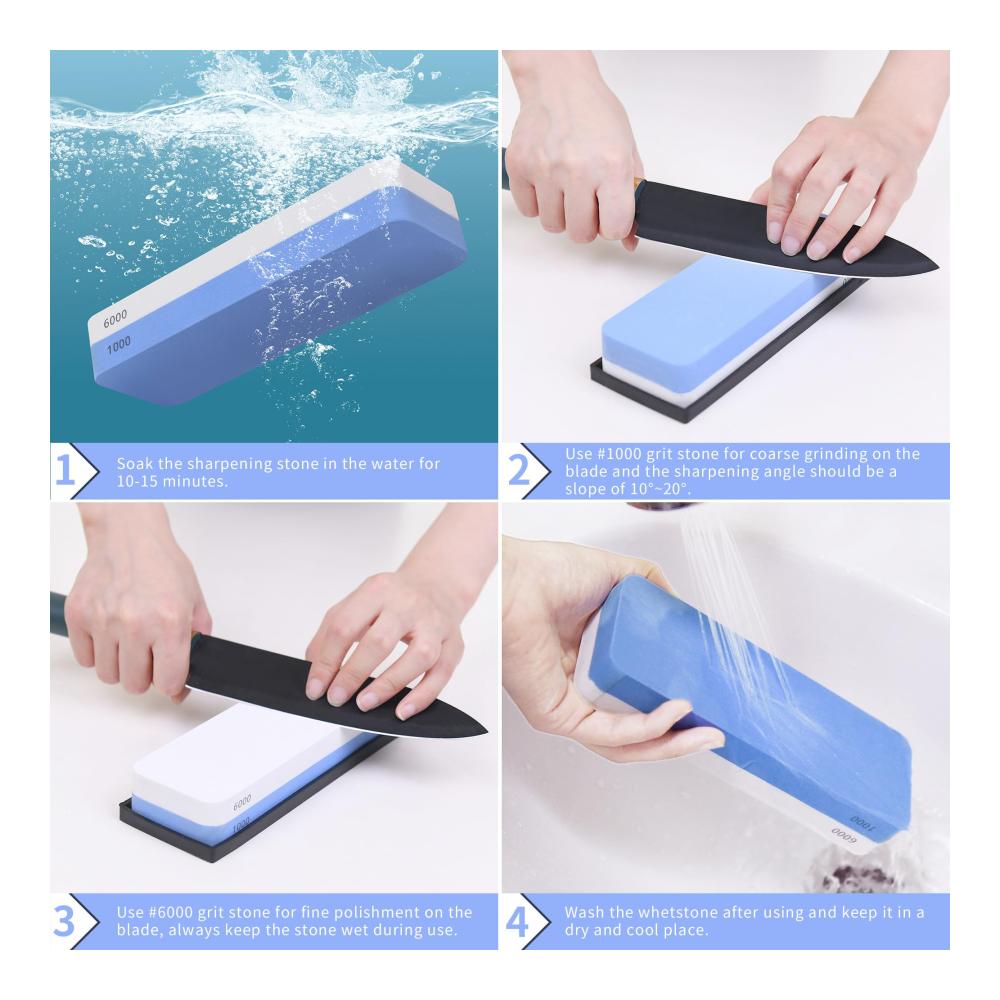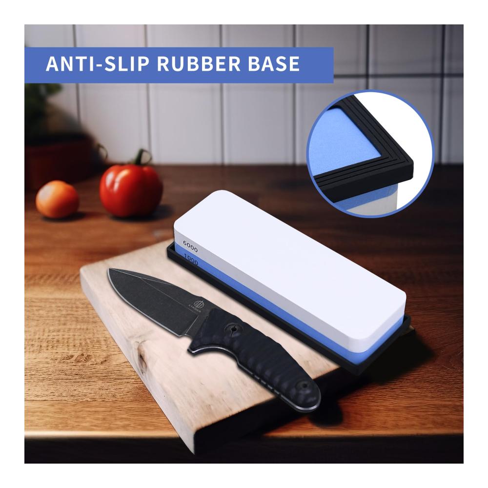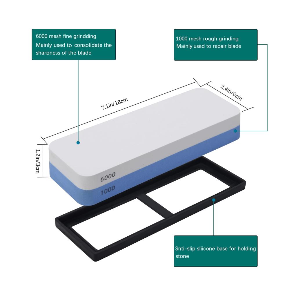 Unser doppelseitiger Messerschärfer wird Ihre Erwartungen übertreffen. Mit der groben 1000er Körnung können Sie mühelos stumpfe Klingen wiederherstellen, während die feine 6000er Körnung für den abschließenden Schliff und die perfekte Schärfe sorgt. Die sorgfältig ausgewählten Materialien gewährleisten eine gleichmäßige Abnutzung und eine lange Lebensdauer des Schleifsteins.