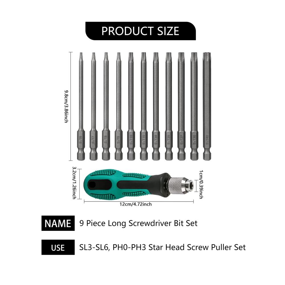 9 Torx Schraubenzieher Bit Set mit Schraubenschlüssel: Sternschraubenzieher Einschließlich SL3, SL4, SL5, SL6, PH0, PH1, PH2, PH3 und Schraubenschlüssel. In der Installation kann leicht saugen Schrauben, Elektro-Schraubendreher, manuelle Schraubendreher, elektrische Bohrmaschine, Gruppe allgemeine Werkzeuge.Hochwertige Materialien: Schraubendreher set bestehen aus S2 Stahl, beständig gegen hohe und niedrige Temperaturen, überlegene Härte, die Abnutzung reduzieren und Langlebigkeit garantieren, was stärker und langlebiger ist als andere.Magnetische Spitze: Magnetisierbare Torx-Schraubendreher-Bits können leicht Schrauben an ihnen festhalten, was Ihre Arbeitseffizienz verbessert. Jede Kante des Torx-Bits kann präzise verriegelt werden, keine Schäden an der Schraube und dem Schraubendreherkopf.Anti-Rost-Beschichtung: Dieses nützliche Torx-Schraubendreher-Set ist als Ganzes wärmebehandelt und hat eine hohe Torsion und Härte, nicht leicht zu brechen und zu verschleißen, exquisite Verarbeitung, jede Kante kann präzise verriegelt werden.Breite Anwendungen: Sicherheits-Torx-Bit-Set kann in Autos, Reparaturen, Lastwagen, Autos, Motoren, Motorrädern, Innenräumen, Armaturenbrettern, Computern, Spielzeug, Geräten und Unterhaltungselektronik verwendet werden.