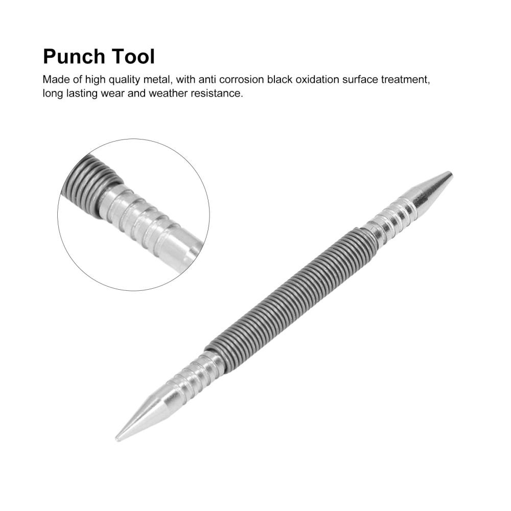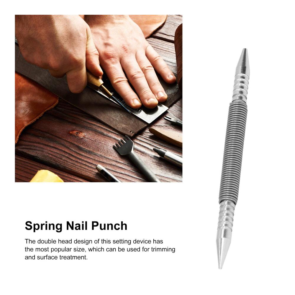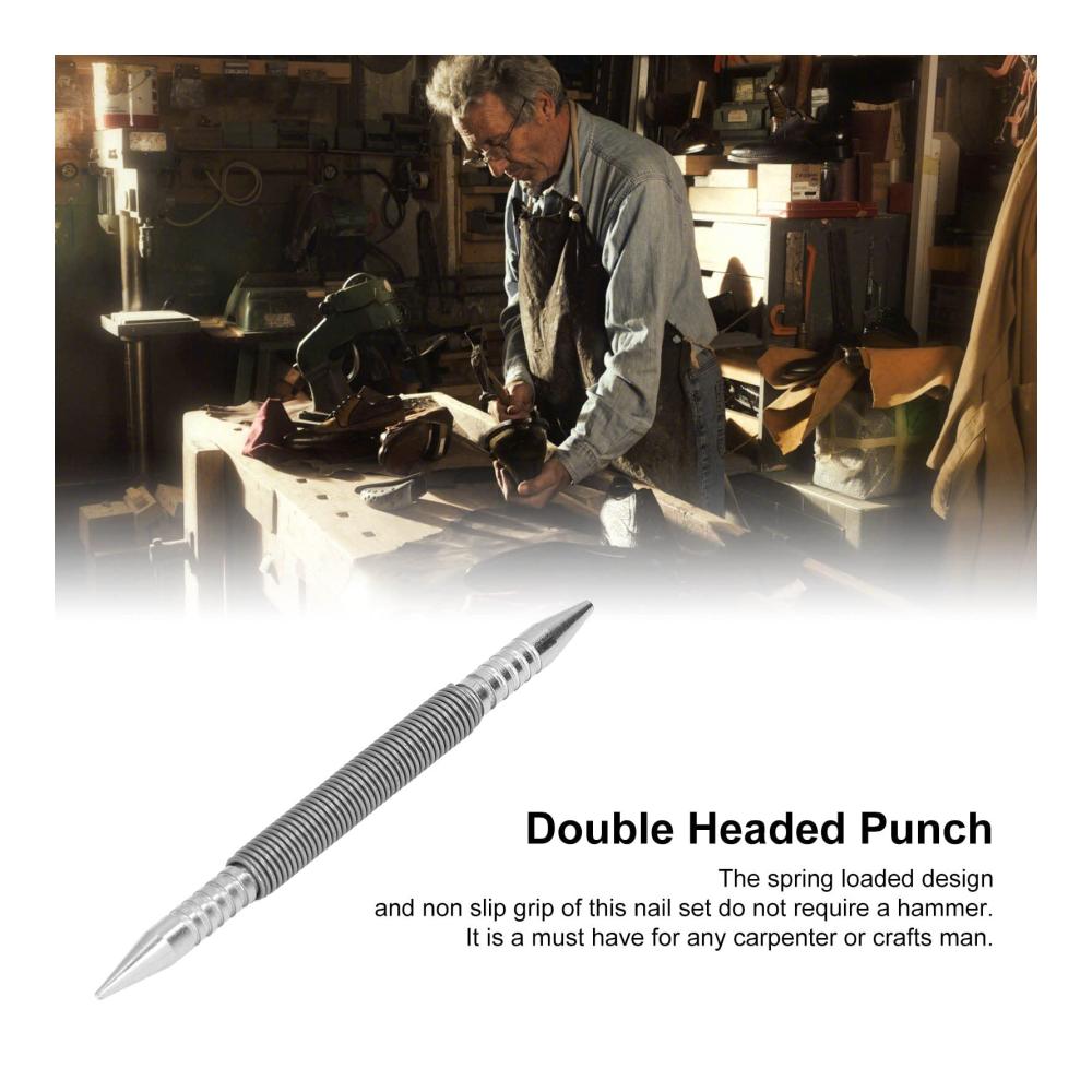 Doppelköpfiger Feder-Nagelstanzer: Dieses Nagelstanzwerkzeug hat ein doppelköpfiges Design, das für zwei verschiedene Nagelgrößen geeignet ist. Sie können problemlos zwischen den Köpfen wechseln und den verwenden, der Ihren Anforderungen entspricht. Der federbelastete Mechanismus ermöglicht das Schlagen von Nägeln ohne Verwendung eines Hammers, was bequem und sicher ist.