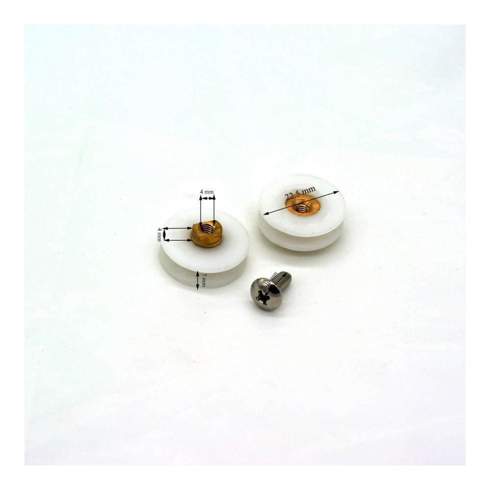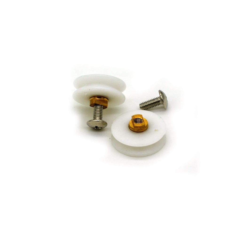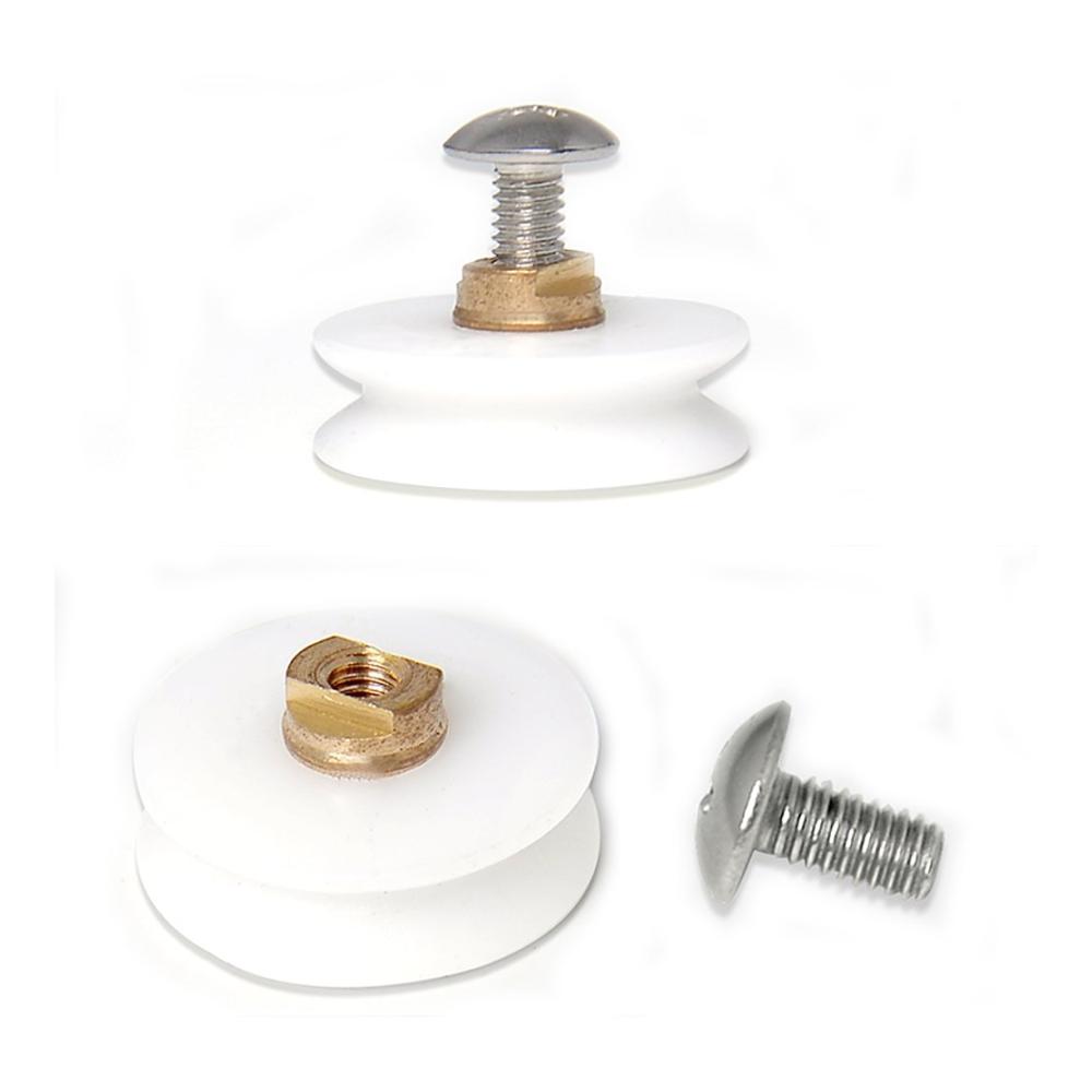 Ersatzrollen für Duschtüren mit Schraube zum Befestigen der Rolle. Diese Duschtürrolle sorgt für ein reibungsloses Schieben. Weiße Nylon-Duschtürrolle mit Messingkern. Beschreibung: Duschtürrollen mit Innengewinde, passend für 6-8 mm Glaslochroller-Größe (Durchmesser). x T: Ca. 22,5 x 7 mm Gewindedurchmesser: Ca. 4 mm. Material: Nylonrad mit Messingkern Farbe: Weiß. Lieferumfang: 8 x Rollen für Duschkabinentür.