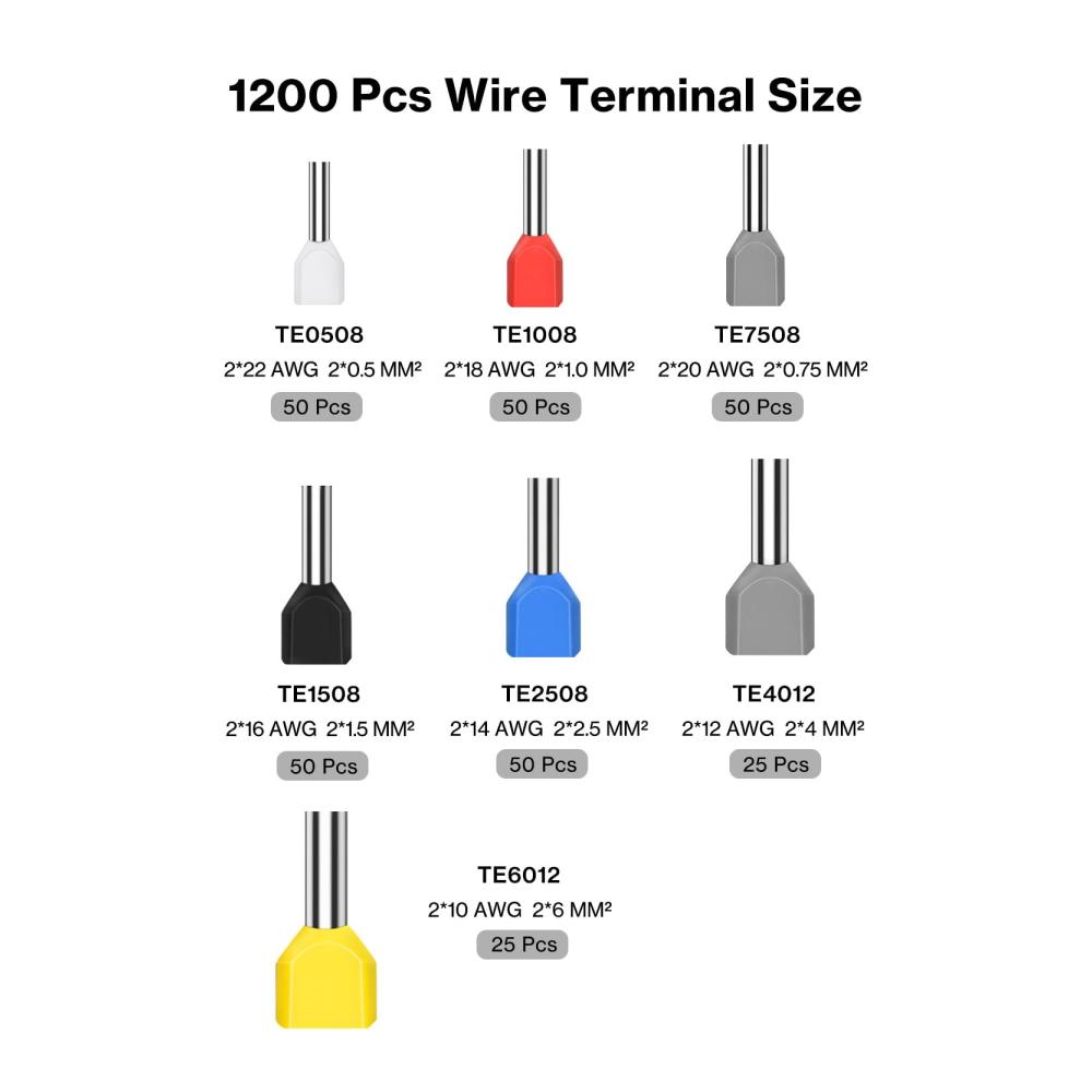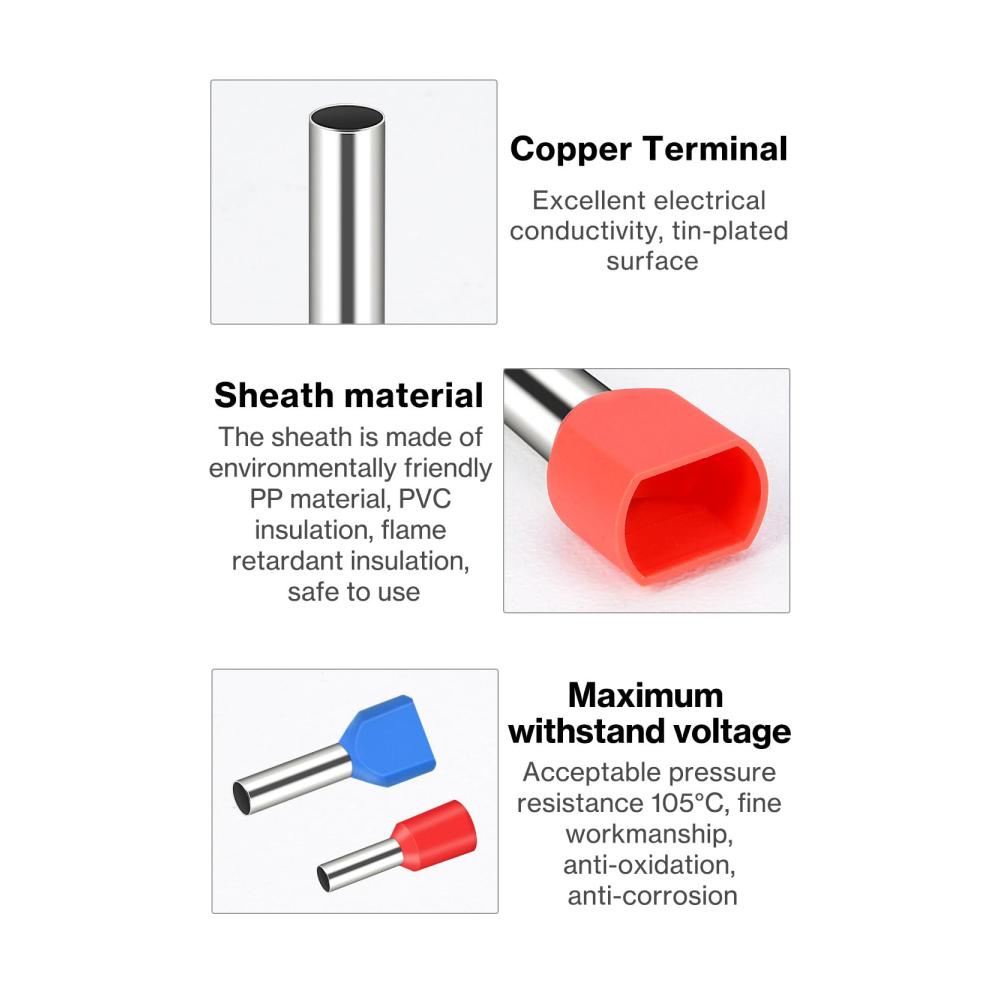 【7 Typen Zwillings Aderendhülse】2*0,5 mm², 2*0,75 mm², 2*1,0 mm², 2*1,5 mm², 2*2,5 mm², 2*4 mm², 2*6 mm², besonders für die Montage und Klemmung von 2 Litzenleitern geeignet.