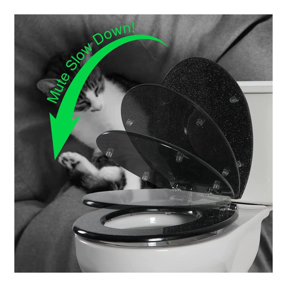 Herzlich willkommen bei unserem exklusiven Glitzer Toilettendeckel mit Absenkautomatik! Ein Hauch von Luxus und Eleganz für Ihr Badezimmer erwartet Sie mit unserem ovalen Toilettensitz, der mit verstellbarem Edelstahlscharnier und Quick Release-Funktion für eine mühelose Reinigung ausgestattet ist. Der WC-Sitz ist nicht nur funktional, sondern auch ein Blickfang mit seinem stilvollen Schwarz und einem einzigartigen Motiv, das Ihrer Toilette eine besondere Note verleiht.