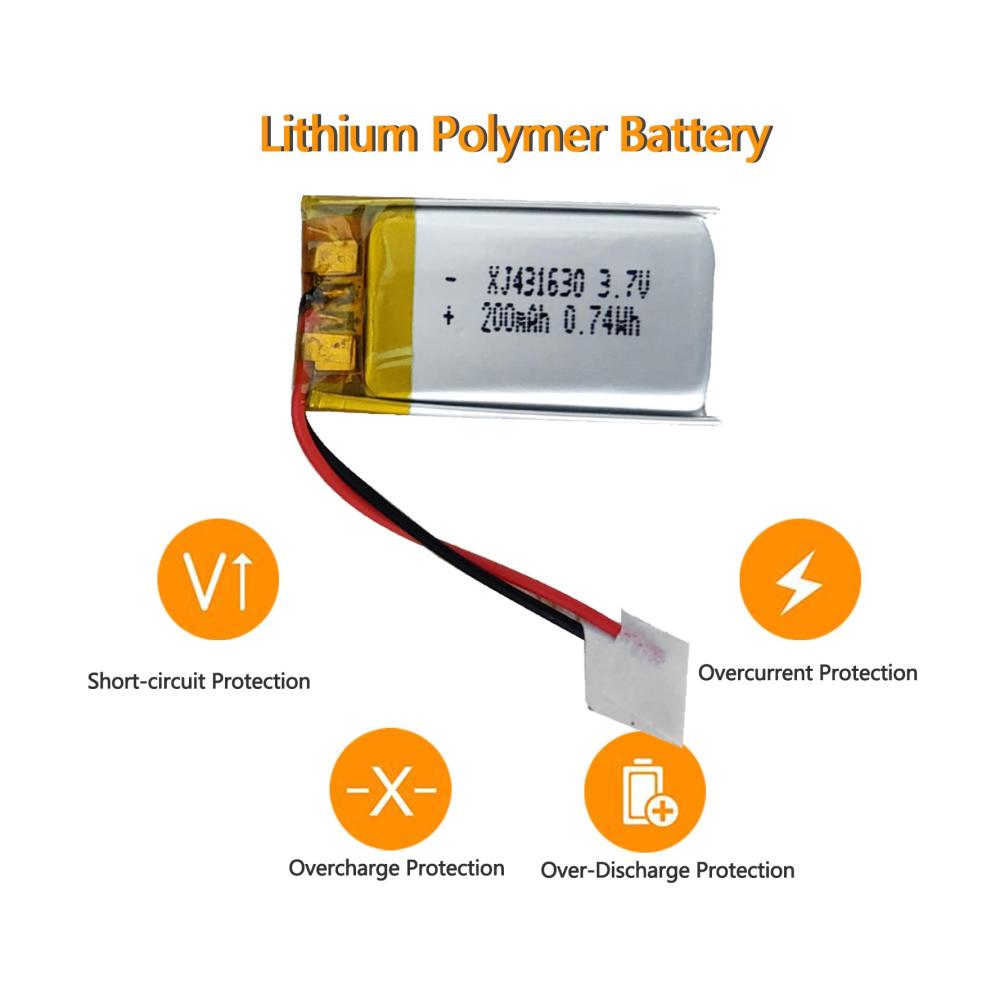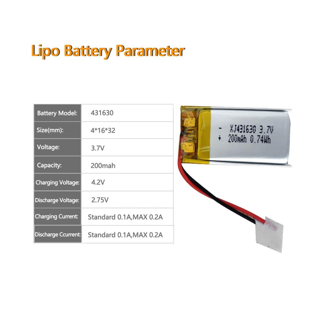 GRUNDLEGENDE INFORMATIONEN – Spannung: 3,7 V; Kapazität: 200 mAh, Batteriegröße (BxLxH): 4 X 16 X 32 mm