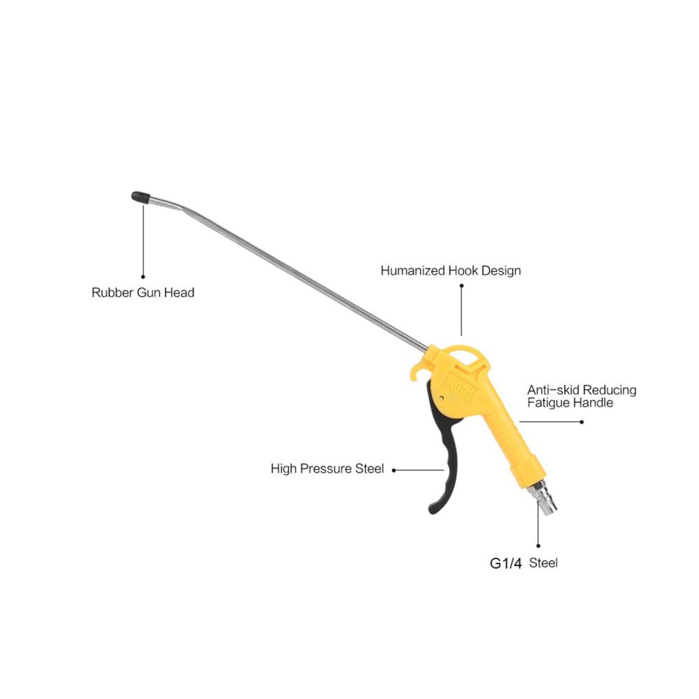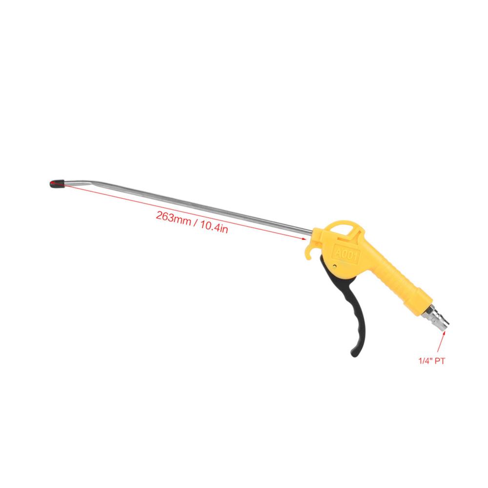 Die präzise Verarbeitung dieser Blaspistole gewährleistet eine effiziente Staubentfernung in verschiedensten Anwendungen. Mit einer beeindruckenden 10 Zoll langen, abgewinkelten Düse erreichen Sie mühelos auch schwer zugängliche Stellen. Diese Funktion macht unsere Luftblaspistole zu einem unverzichtbaren Werkzeug für präzise Reinigungsarbeiten.