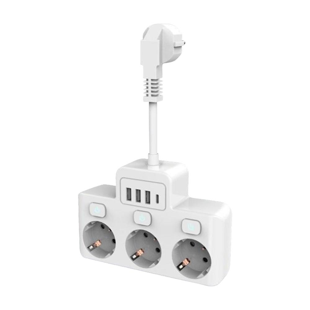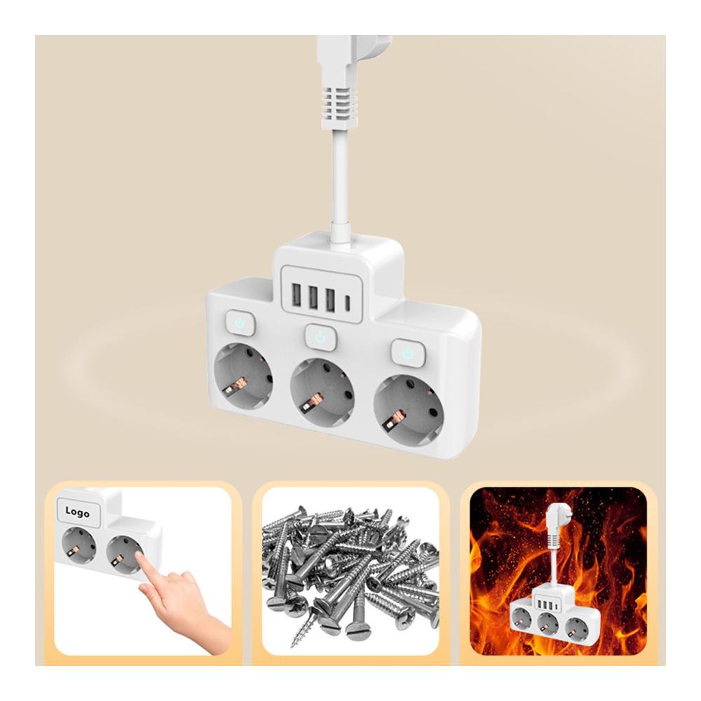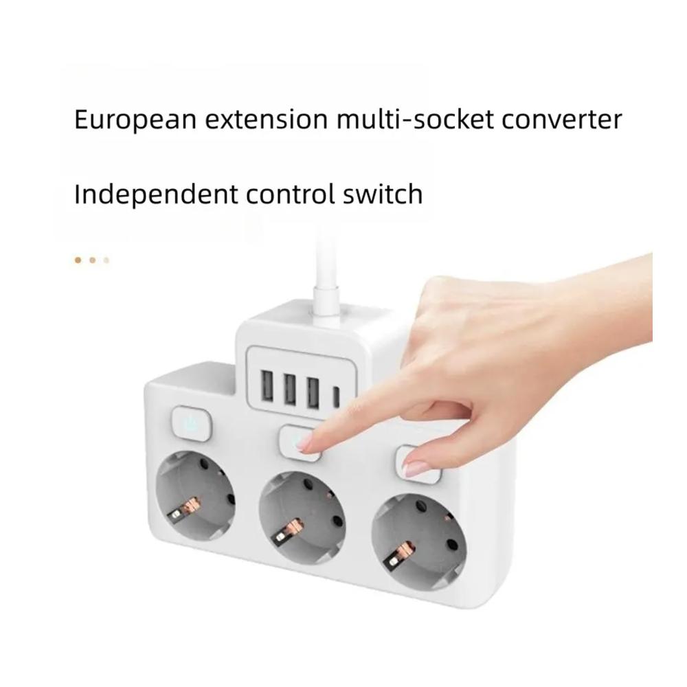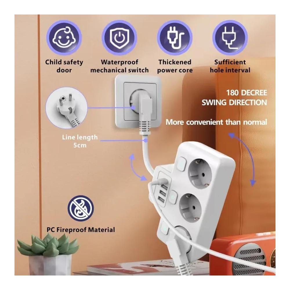 Die innovative Gestaltung dieser Mehrfachsteckdose umfasst 3 Steckdosen, die Ihnen genügend Raum für Ihre elektronischen Geräte bieten. Darüber hinaus verfügt unser Adapter über 3 USB-Anschlüsse und 1 praktischen Type-C Port, um Ihre Geräte bequem aufzuladen. Die Flexibilität der Kabel ermöglicht eine mühelose Anpassung an Ihre individuellen Bedürfnisse.