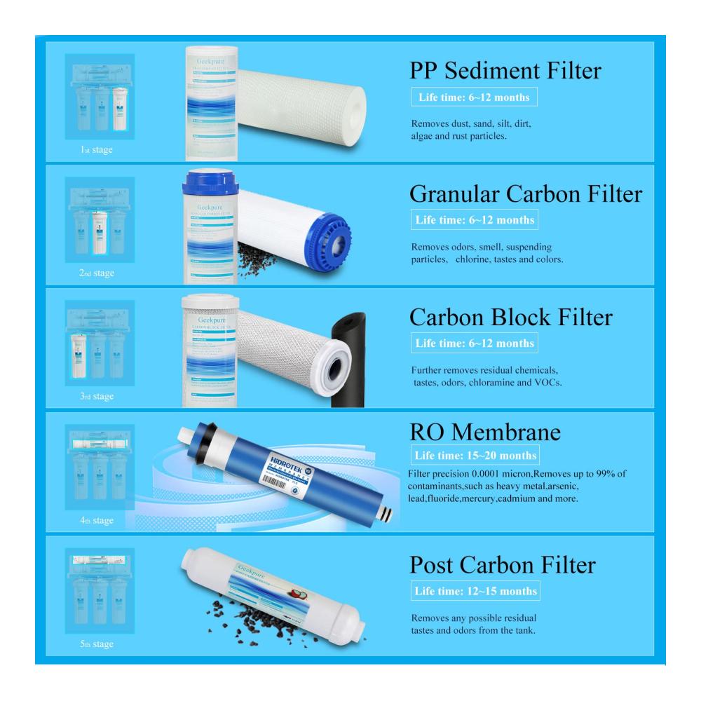 Universelle StandardgrößeDie Wasserfilter von Geekpure höchster Qualität haben eine universelle Industriestandard größe und passen zu den meisten Umkehrosmoseanlage und Wasserfiltersystemen für Privathaushalte. Insgesamt sind 5 Stück Filter in der Box. das ist 1 Stück PP-Sediment, 1 Stück körnige Aktivkohle, 1 Stück Kohleblockfilter, 1 Stück 50GPD-Umkehrosmose membran und 1 Stück Post-Inline-Kokoskohle. Und 2 Stück 1/4 „NPT-Schnellkupplungen und 1 Rolle Teflon-Dichtungsband für Nachkohlefilter. | PP-SedimentfilterEs ist die 1. Stufe des Umkehrosmoseanlage. Funktion: Entfernt Staub, Sand, Schlick, Schmutz und Rostpartikel im Wasser. Spezifikation: Mikronwert: 5 µm, Dimension: 10 x 2,5 Zoll, Betriebsdruck: 30–100 psi, Temperatur: 33–100 °F, Lebensdauer: 6–12 Monate. | Körniger KohlefilterEs ist die 2. Stufe des Umkehrosmoseanlage. Funktion: Entfernt Chlor, Geschmack, Gerüche, Trübungen, Farbstoffe, organische Stoffe, Gerüche, Geruchstrübungen. Spezifikation: Mikronwert: 5 µm, Dimension: 10 x 2,9 Zoll, Betriebsdruck: 30–100 psi, Temperatur: 33–100 °F, Lebensdauer: 6–12 Monate. |