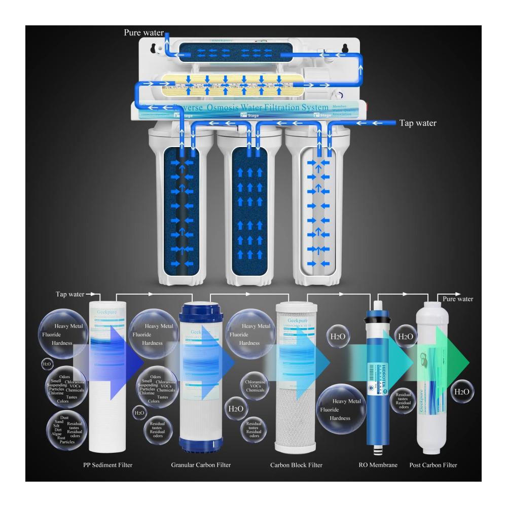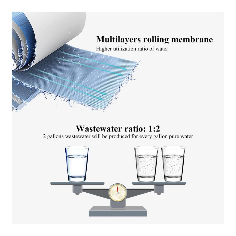 NSF zertifiziertro Membranfilter bis 0,0001 Mikron, Reduzieren Sie 99% Verunreinigung, einschließlich Arsen, Blei, Quecksilber, Fluorid, Härte, Cadmium, Chlor, Geschmack und mehr 1000 Verunreinigungen, um gesundes, sicheres und reines Wasser zu liefern
