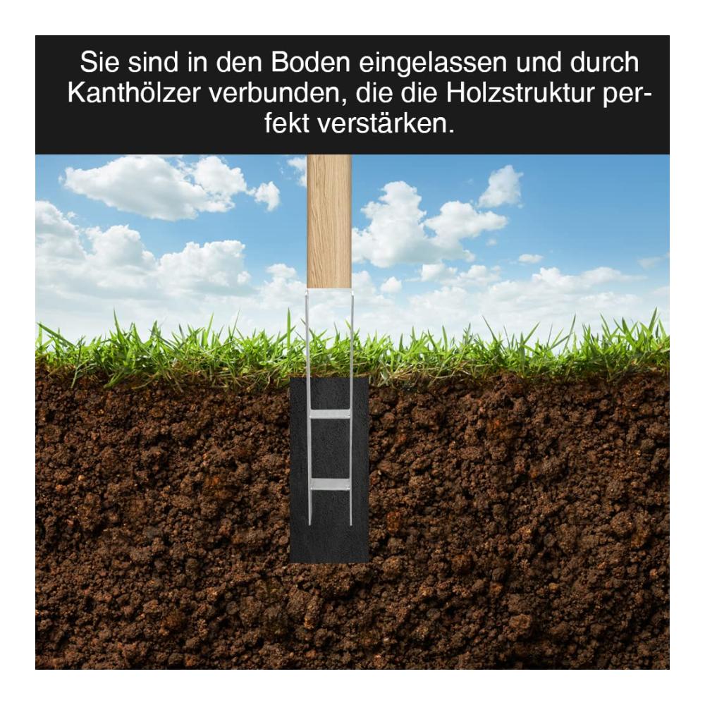 Die Pfostenanker sind aus hochwertigem Material gefertigt, das Korrosionsbeständigkeit und Wetterfestigkeit bietet. Dies gewährleistet eine langfristige Nutzung ohne Qualitätsverlust. Die präzise Verarbeitung und das durchdachte Design machen die Installation der Pfostenträger einfach und effizient.