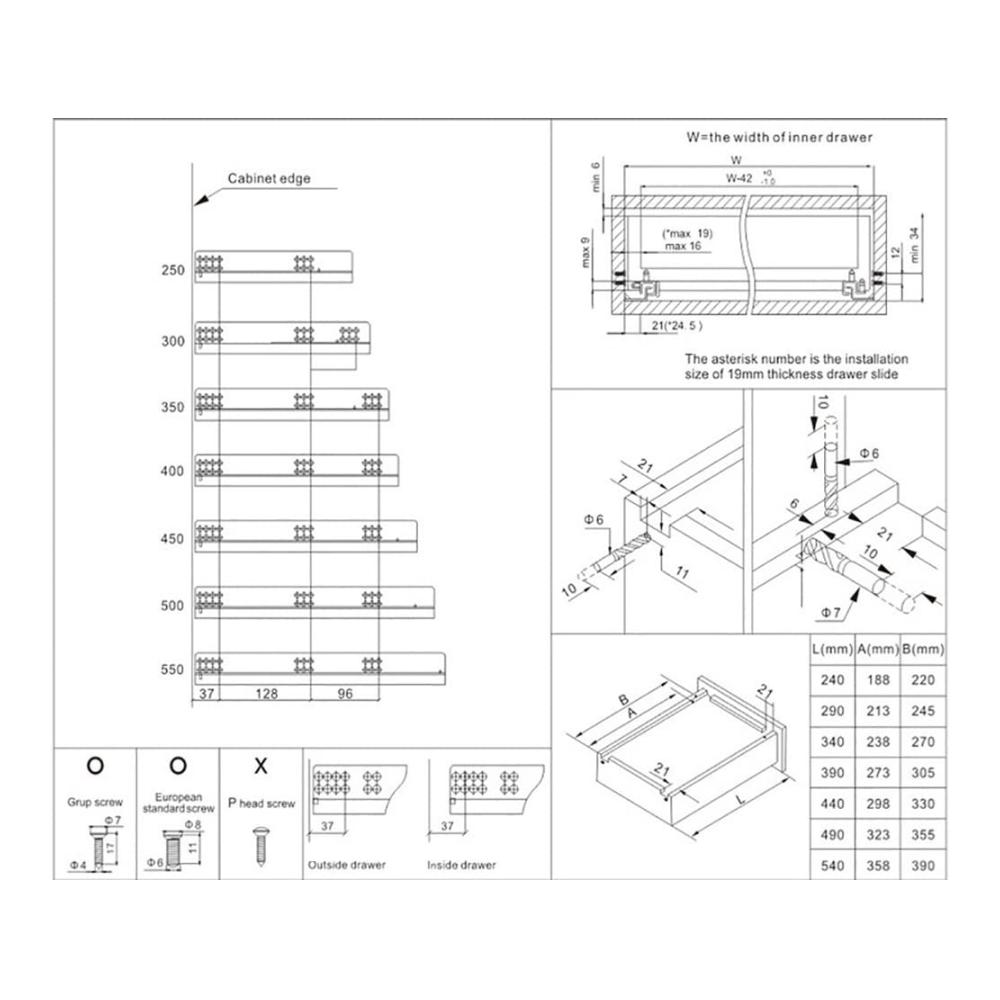 Das Schubladenschiebeschienensystem ist speziell für schwere Lasten ausgelegt, um eine zuverlässige und langlebige Nutzung zu gewährleisten. Das robuste Design sorgt für Stabilität und Sicherheit in Ihrem Schrank. Egal, ob Sie Ihr Schrank-Zubehör verbessern oder ein neues Möbelstück bauen, diese Schubladenauszüge sind die perfekte Wahl.