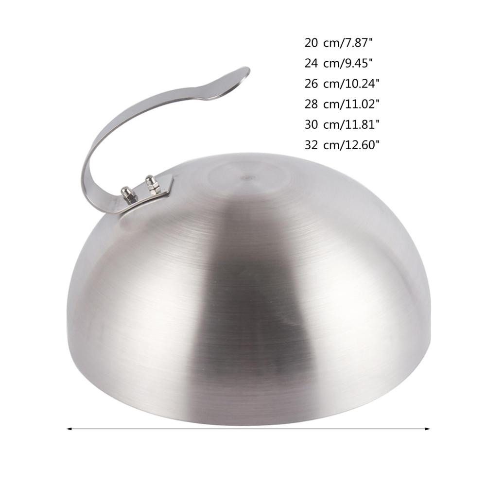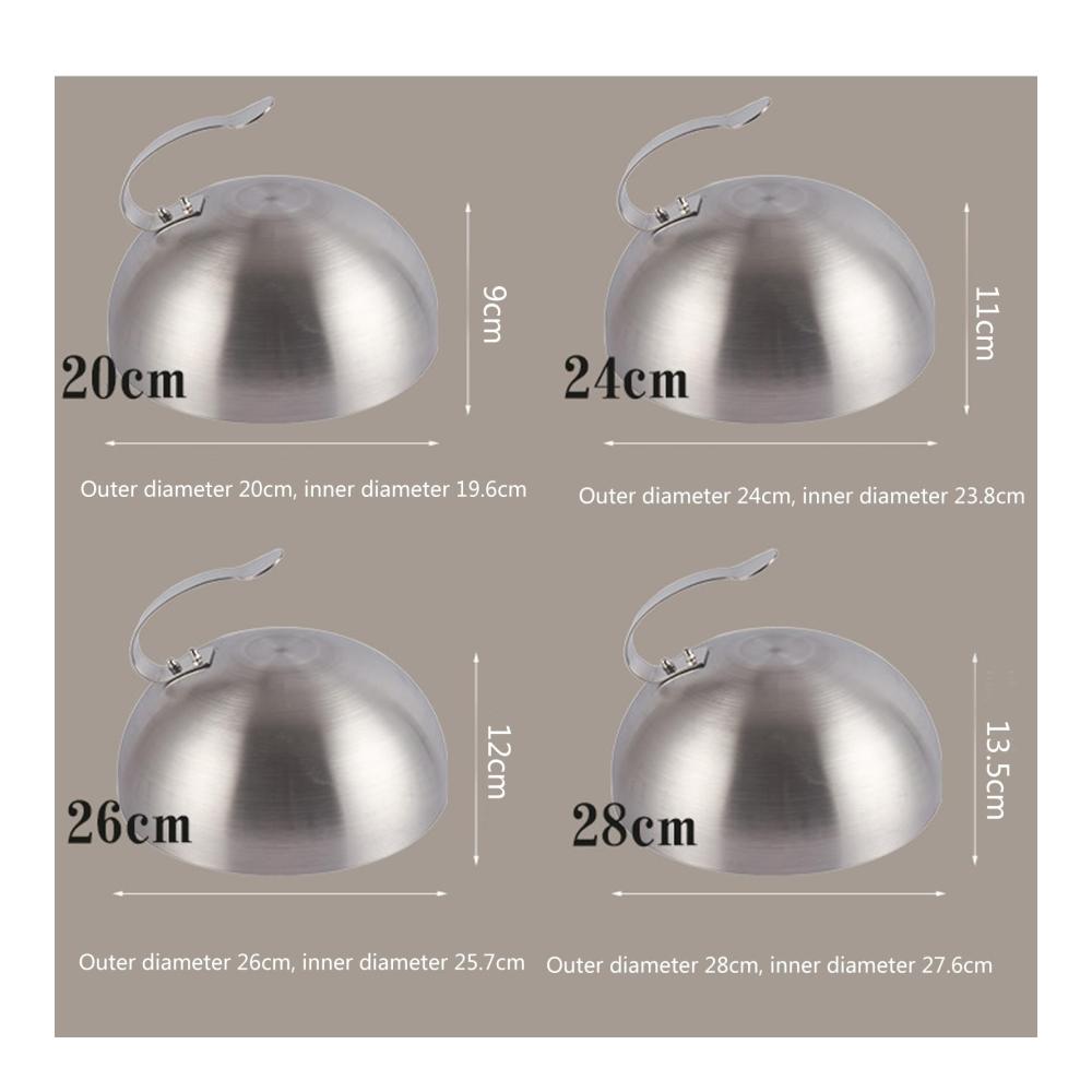 Vielseitige Lebensmittelabdeckung, runde Steakabdeckung, Edelstahl Käseschmelzkuppeln, runde Bratabdeckung für Küche, Restaurants, KochdeckelMerkmale:Erzielen Sie perfekte Kochergebnisse mit dieser Edelstahlabdeckung, die eine gleichmäßige Wärmeverteilung und ein geschmackvolles Ergebnis gewährleistet.Diese auf Langlebigkeit und einfache Wartung ausgelegte Abdeckung sorgt für optimale Temperatur und Feuchtigkeit und garantiert so zarte und schmackhafte Mahlzeiten.Egal, Sie Kochbegeisterte oder Profiköche sind, diese hochwertige Abdeckung ist ein unverzichtbares Küchenwerkzeug.Von intimen Zusammenkünften bis hin zu Outdoor Anlässen bereichert diese vielseitige Hülle Ihre kulinarischen Kreationen und macht jede Mahlzeit unvergesslich.Erleben Sie den Komfort und die Zuverlässigkeit dieser modischen Hülle, die mit einem sicheren für eine mühelose Handhabung ausgestattet ist.Spezifikationen:Material: EdelstahlDurchmesser Typ 1: 7,87 Zoll (20 cm)Typ2 Durchmesser: 9,45 Zoll (24 cm)Typ 3 Durchmesser: 10,24 Zoll (26 cm)Typ4 Durchmesser: 11,02 Zoll (28 cm)Typ5 Durchmesser: 11,81 Zoll (30 cm)Typ6 Durchmesser: 12,6 Zoll (32 cm)Paket beinhaltet:1x LebensmittelkuppelNotiz:Bitte erlauben Sie 1-2 cm Fehler aufgrund der manuellen Messung. Bitte stellen Sie sicher, dass Sie nichts dagegen haben, bevor Sie bestellen.Aufgrund des Unterschieds zwischen verschiedenen Monitoren spiegelt Bild möglicherweise nicht die tatsächliche Farbe des Artikels wider.