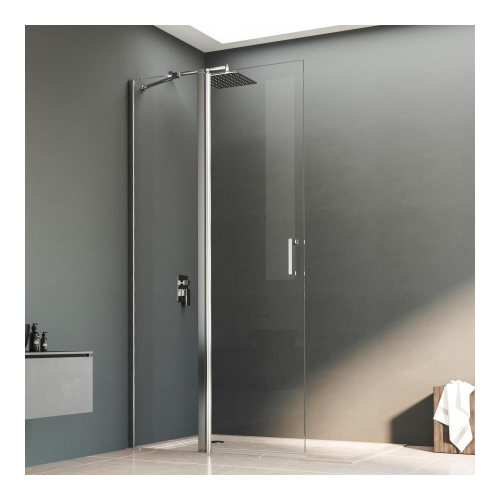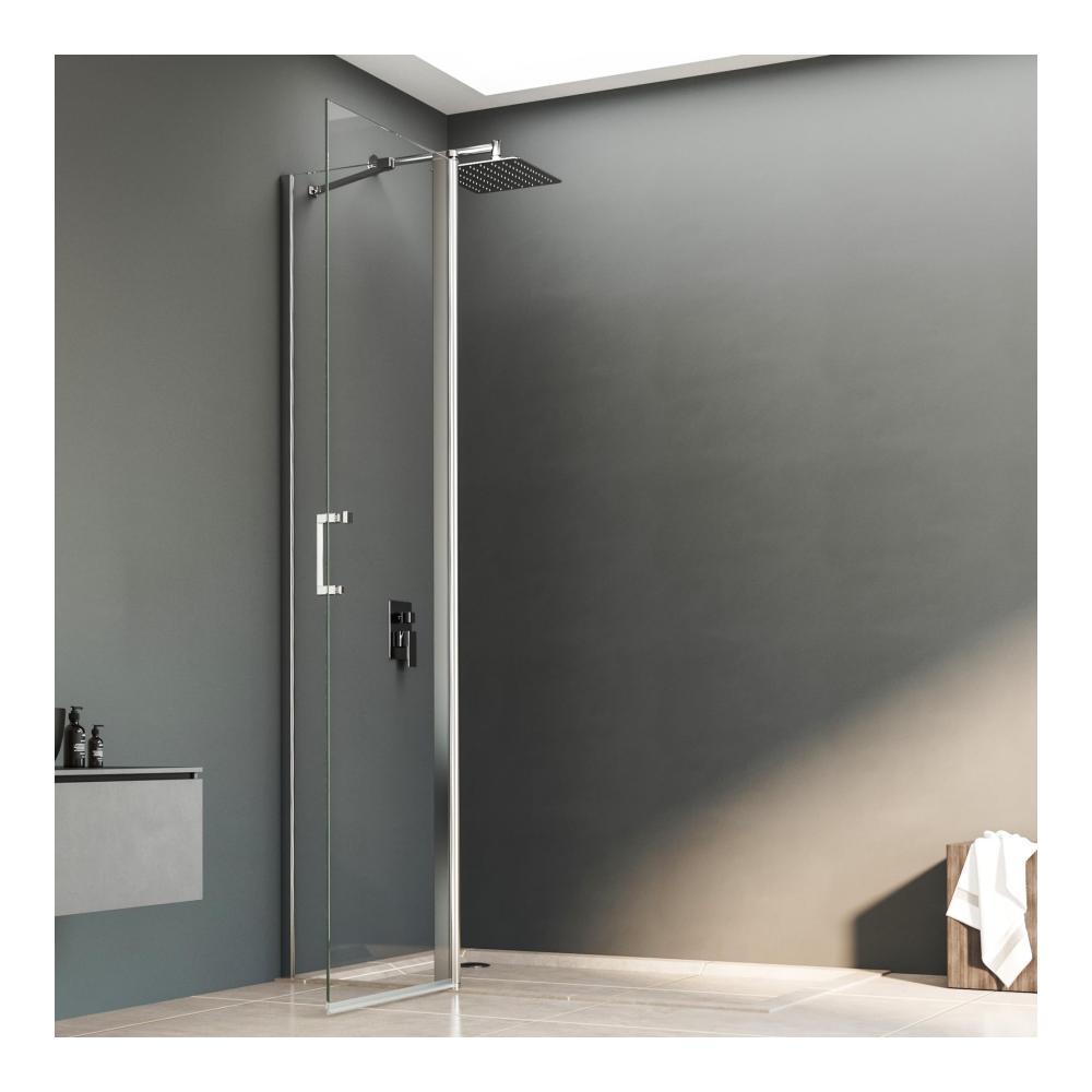 Hochwertige Walk in Duschwand mit einem festen Teil und einem schwenkbaren Teil für jede Seitentür, die durch Aluminiumdrehgelenke verbunden sind, eine effiziente Raumnutzung zu gewährleisten.