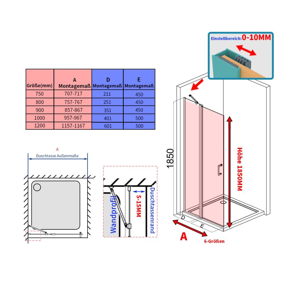 Produkt Größe: 116(Breite 115,7-116,7) x 185(Höhe)cm, 10 mm Wandausgleich. Der robuste Wandanschluss ist aus hochwertigem Aluminium gefertigt und lässt sich auch an schräge Wände anpassen.