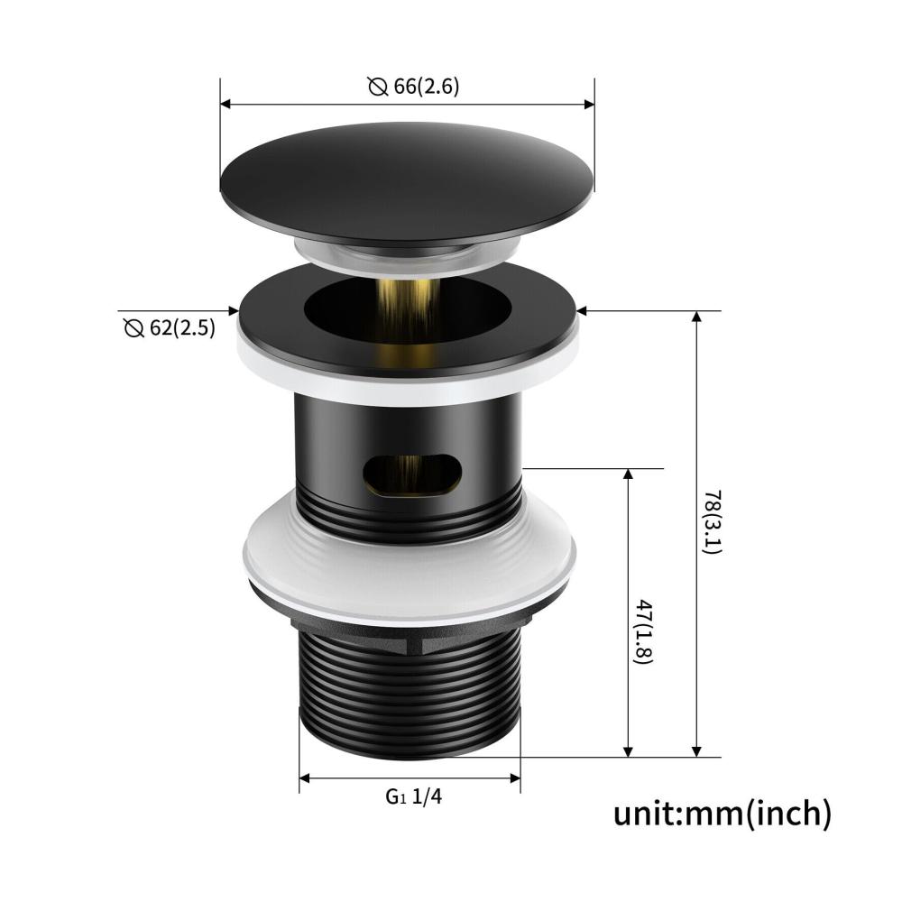 Durch die kinderleichte Montage und Bedienung können Sie die Ablaufgarnitur selbst montieren. Sie können ohne Problehme Ihre alten Verschlussstöpsel oder Excenterstangen ersetzen, da diese Stöpsel an nahezu allen Waschbecken oder Spülen anzubringen sind. Um im Waschbecken voll gelaufendes Wasser ablaufen zu lassen, wird der Deckel wieder durch einfaches Klick System am Deckel betätigt. DIN Norm passt zu allen handelsüblichen Siphons – mit Überlauf Click Clack Funktion (1 mal drücken „Zu“ / noch mal drücken „Auf“) Höhe 80mm Abdeckung 66mm Gewinde 40 mm [1 1/4 Zoll) Oberfläche:mit einer mattschwarzen Lieferumfang: 1 x Pop Up Ablaufgarnituren mit Überlauf