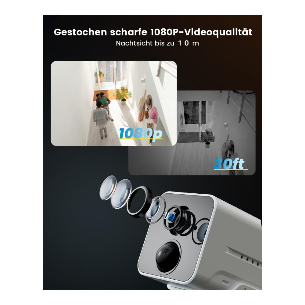 Genießen Sie gestochen scharfe Bilder in Full HD (1080P) Qualität, egal ob es Tag oder Nacht ist. Die Infrarot-Nachtsichtfunktion sorgt für klare Aufnahmen, auch bei völliger Dunkelheit, und gewährleistet so eine lückenlose Überwachung rund um die Uhr.