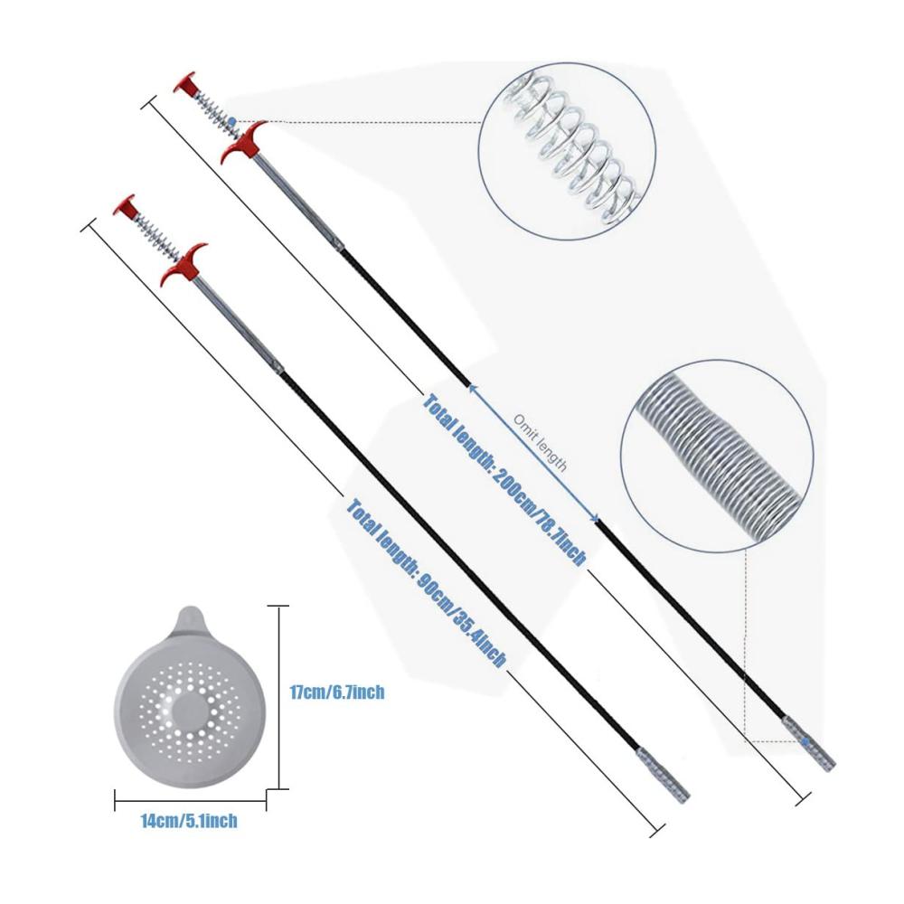 √ Das Paket enthält: 2 verschiedene größen Abflussreiniger spirale(90 cm/35.43 zoll, 200 cm/78.74 zoll) und 1 Abfluss Sieb.