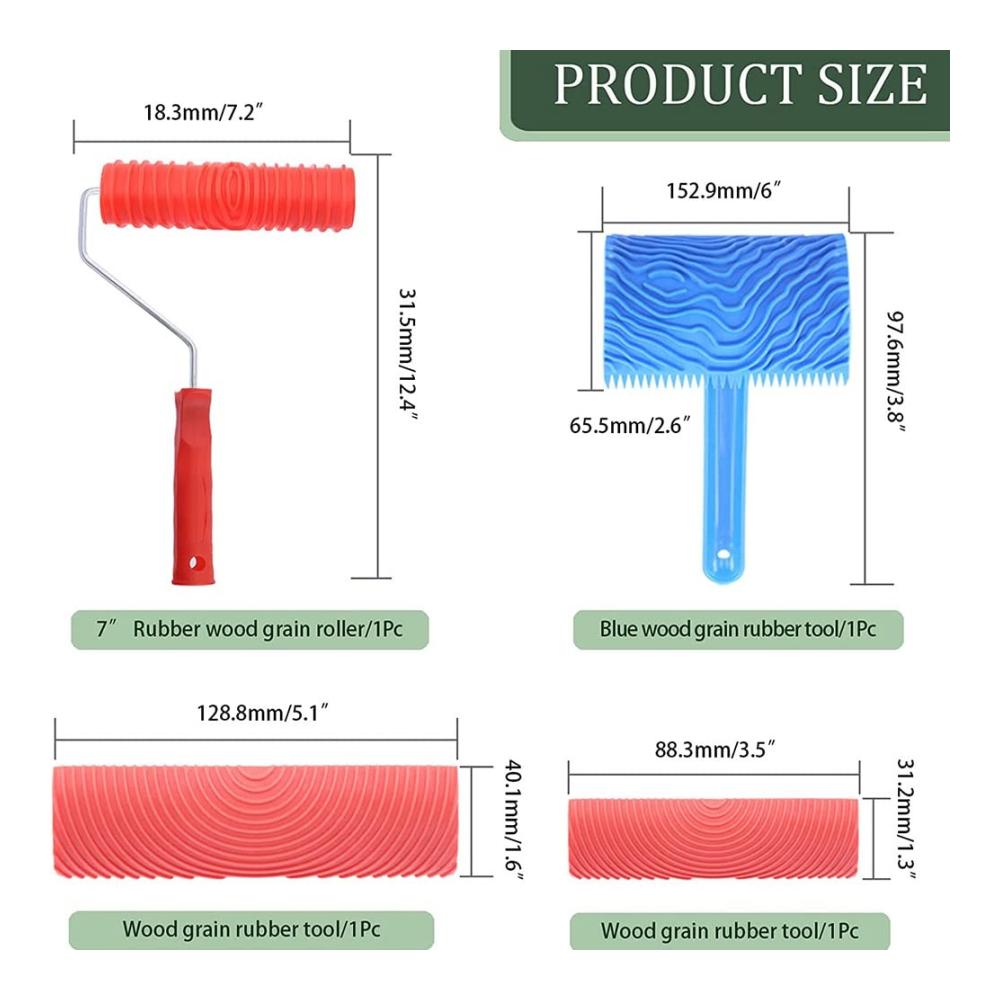 Pinkliar Holzstrukturwalze: 48 mm x 175 mm x 300 mm/1,9 x 7 x 11,8 )MS21 Malwerkzeug mit roter Körnung: 105,5 mm x 36,5 mm/ 4,2 x 1,4 und 130 mm x 40 mm/5,1 x 1,5 MS16 Malwerkzeug mit Körnung: 96,5 mm x 60 mm x 90 mm/3,8 x 2,4 x 3,5 [Wie benutzt man:]Schritt 1: Fügen Sie Farbe auf die Holzmaserung hinzu, wo Sie Dekoration benötigen.Schritt 2: Rollen Sie das Holzmaserungswerkzeug, bevor die Textur vollständig trocken ist.Schritt 3: Später können Sie ein einzigartiges und schönes Finish an Wänden und Decken erstellen[Paket enthalten:]2 Stück —- MS21 Holzmaserungswerkzeug1 Stück —- MS16 Holzmaserungswerkzeug1 Stück —- HolzmaserungswalzeInsgesamt 4 StkFarbe:rot blauMaterial: GummiPackungsinhalt:1 Satz x HolzmaserungsherstellerNur der oben genannte Paketinhalt, andere Produkte sind nicht enthalten.Hinweis: Wegen der Lichtreflexion und Bildschirme könnte der Farbeton in den Fotos sowie des tatsächlichen Produkts etwas unterschiedlich sein. Der erlaubte Messfehler ist /- 1-3 cm.