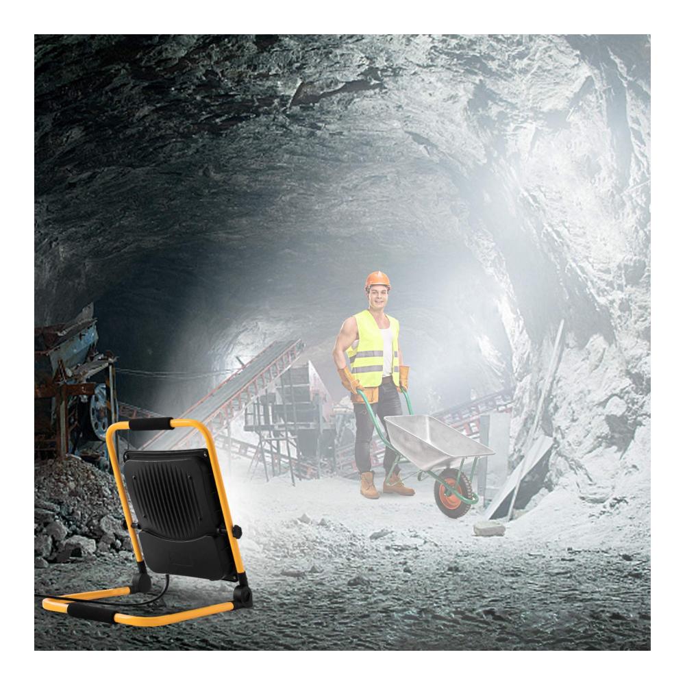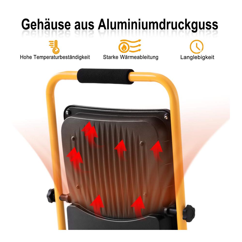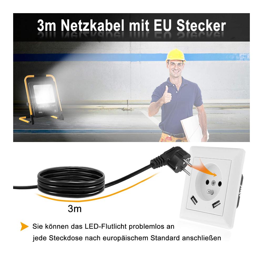 Mit seinem stabilen Standgestell und dem praktischen Tragegriff ist dieser LED Baustrahler äußerst mobil und flexibel einsetzbar. Das 3m lange Netzkabel mit Stecker ermöglicht eine bequeme Stromversorgung, während die Wasserdichtigkeit nach IP66 auch den Einsatz unter widrigen Wetterbedingungen erlaubt.