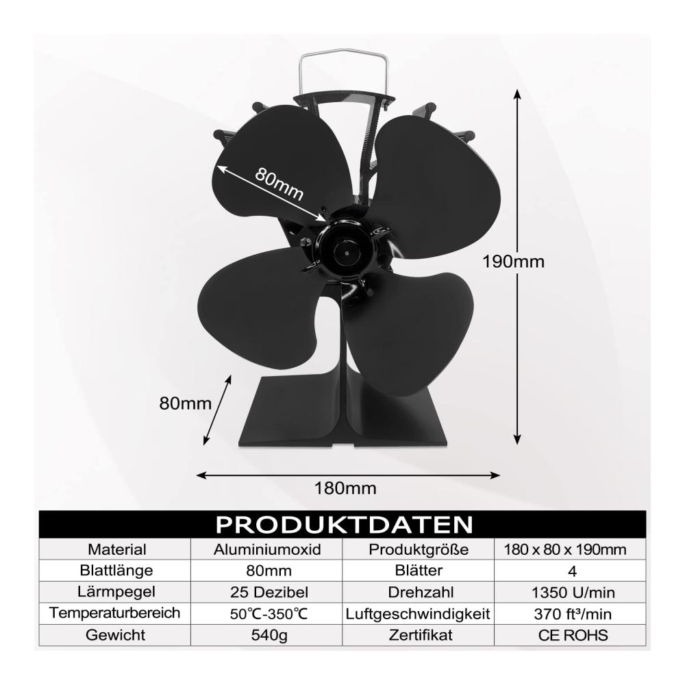 – **Leistungsstarkes Design:** Mit 4 Blättern sorgt unser kaminbetriebener Lüfter für eine effektive Zirkulation warmer Luft im Raum, ohne auf externe Stromquellen angewiesen zu sein.