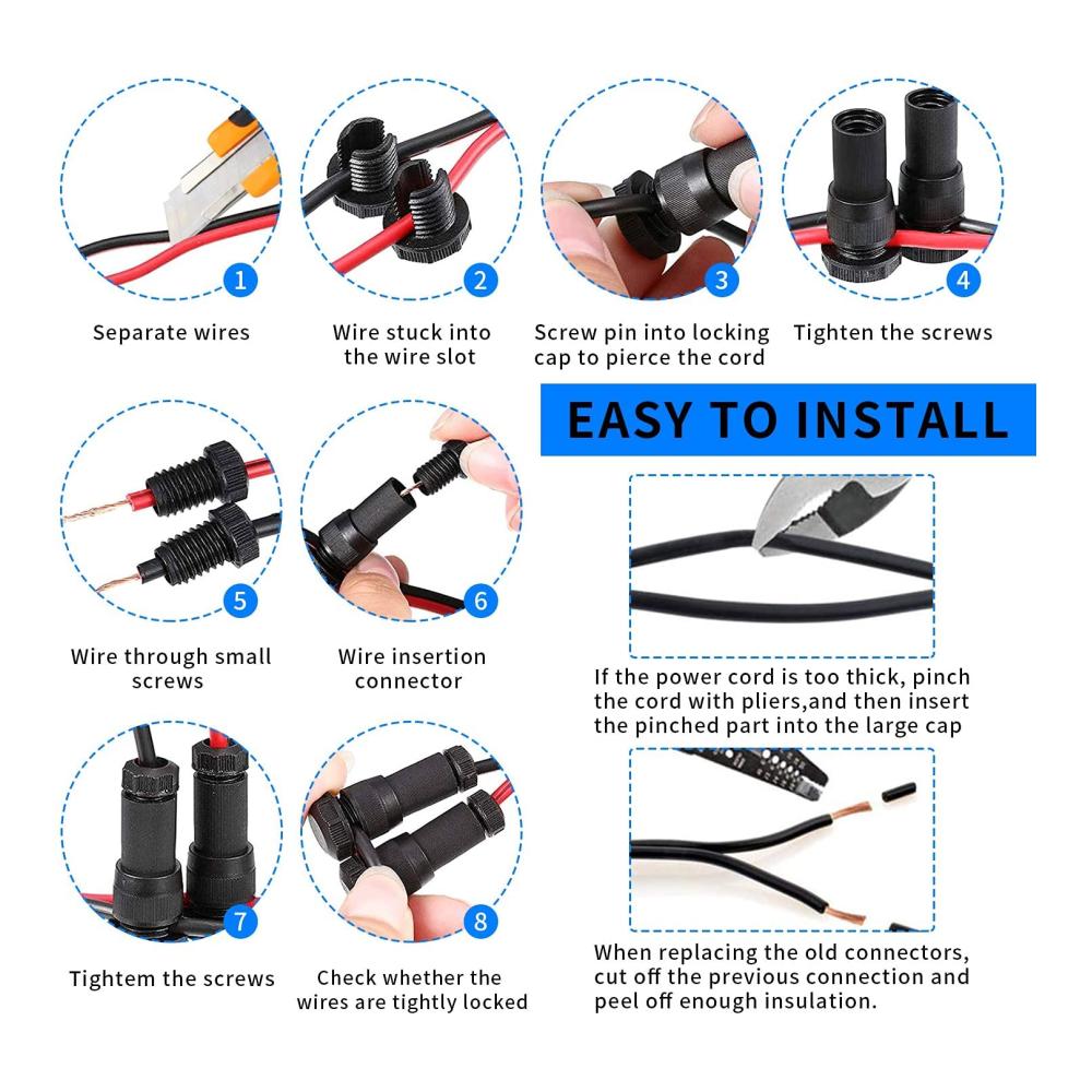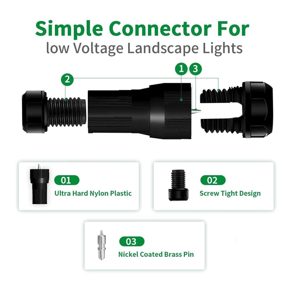Hochwertige Steckverbinder: Diese Niederspannungskabelstecker bestehen aus superhartem Nylonkunststoff und hochleitfähigen vernickelten Messingstiften. Im Vergleich zu anderen Materialien sind unsere Landschaftsbeleuchtungsanschlüsse langlebiger und effizienter, haben eine längere Lebensdauer und werden wiederholt verwendet.
