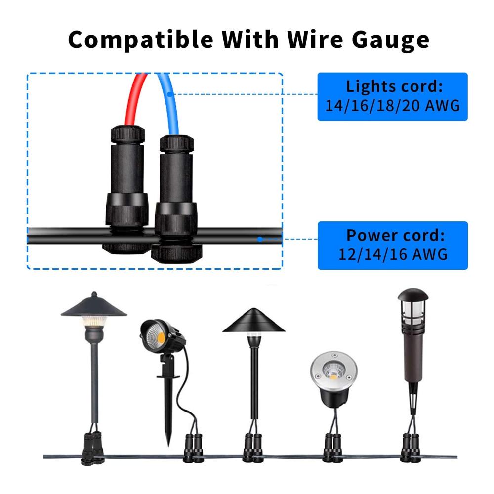 Breite Anwendung: Perfekt für 12- und 14-Gauge-Kabel mit Niederspannungs-Landschaftsbeleuchtung. Weit verbreitet für Garten, Weg, Gehweg, Auffahrt, Hof, Terrasse, Rasen, Wände, Bäume, Fahnen usw., perfekter Ersatz für Malibu, Moonrays, Paradise, Kichler oder Hinkleys fehlerhaften Stecker.