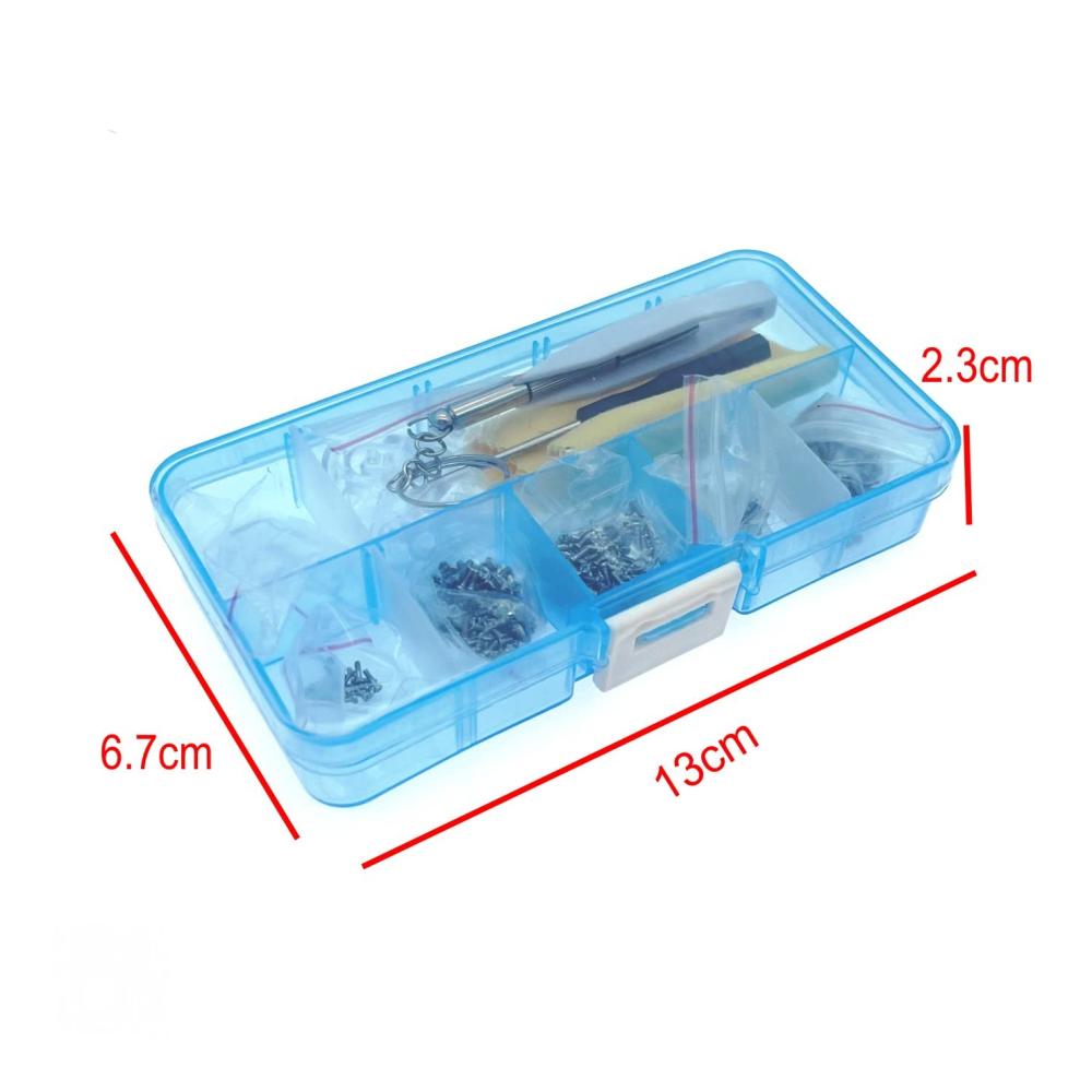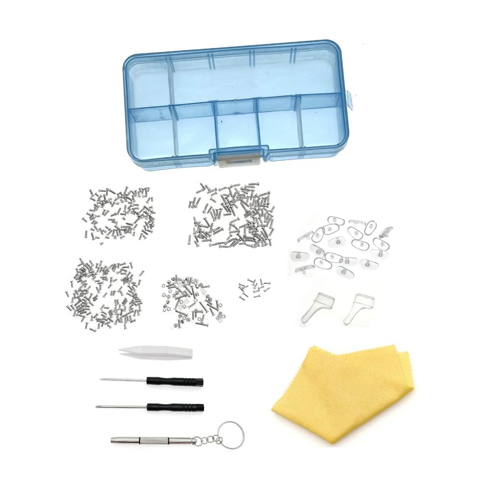 Unser Sonnenbrillen-Schrauben-Werkzeug-Set hat verschiedene Arten von Schrauben (Menge über 500 Stück), mehrere Paar Silikon-Nasenpads, 1 Paar Brillenbeinhaken, Kunststoffpinzette, 3 Arten Mini-Schraubendreher und 1 x Brillentuch.