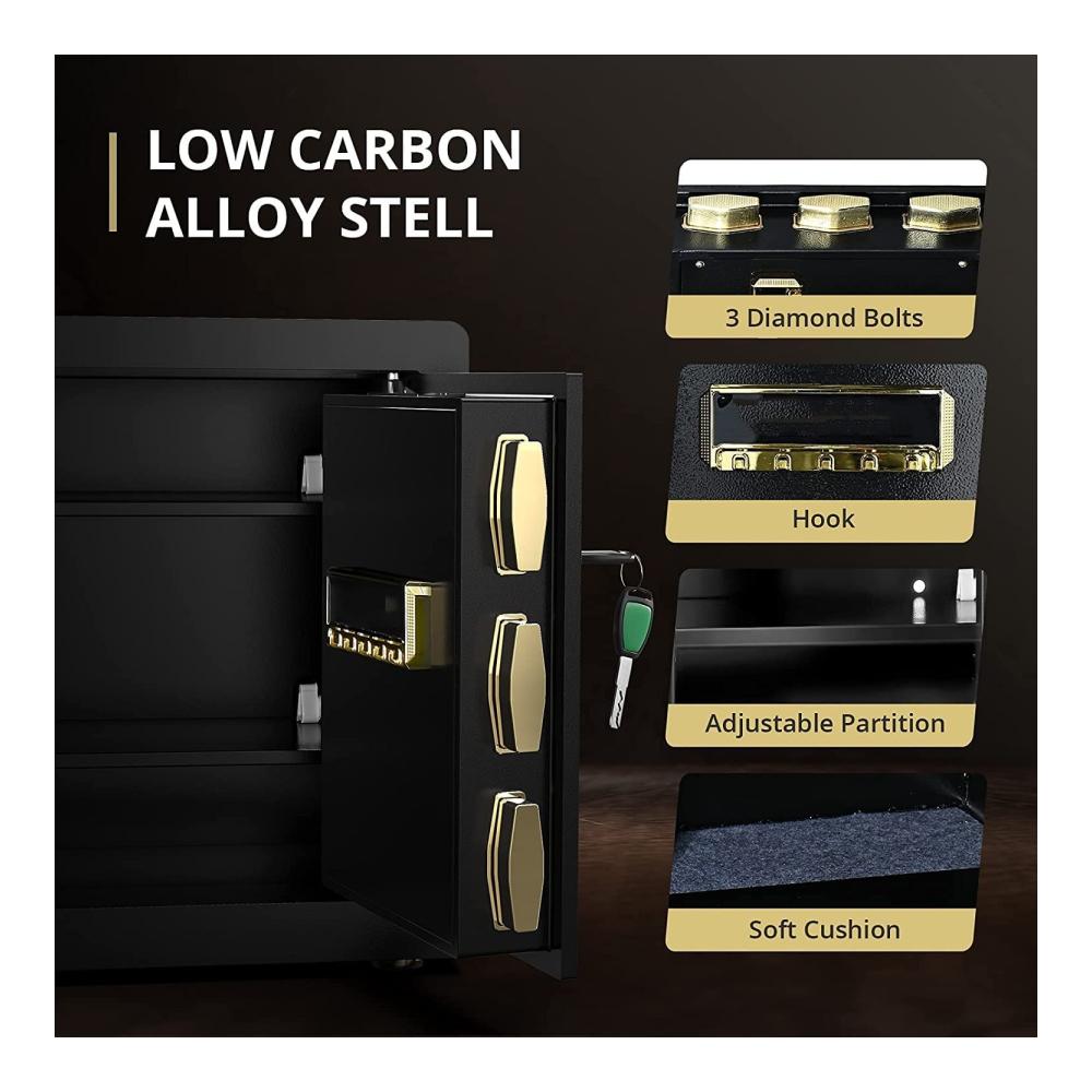 [Warnalarmsystem] Das Schrankalarmsystem wird aktiviert, nachdem der Safe drei Passworteingaben fehlgeschlagen ist oder stark vibriert hat.Die Cabinet Safes können den Alarm stoppen, indem Sie das richtige Passwort eingeben, oder Sie können den Hauptschlüssel verwenden