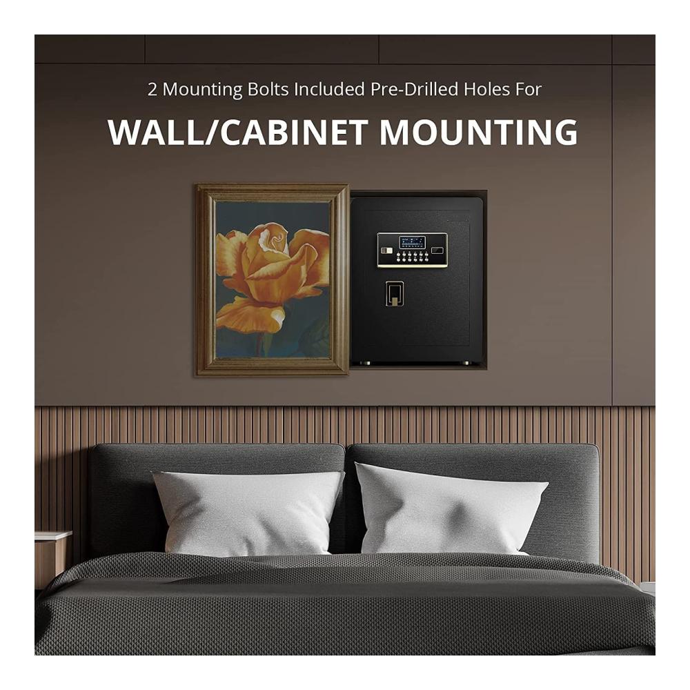 [Installation und Innenraum] Die Schranktresore haben vorgebohrte Löcher für die Installation.Verwenden Sie die mitgelieferten Ankerbolzen, um den Tresor sicher in der gewünschten Position zu verriegeln.Die Schaumstoffpolsterung im Inneren des Tresors schützt Ihre Wertsachen vor Beschädigungen.Wenn die Tresorbatterie leer ist, sorgen zwei Notschlüssel für Backup-Möglichkeiten.Wenn Sie die Schranksafes nicht installieren