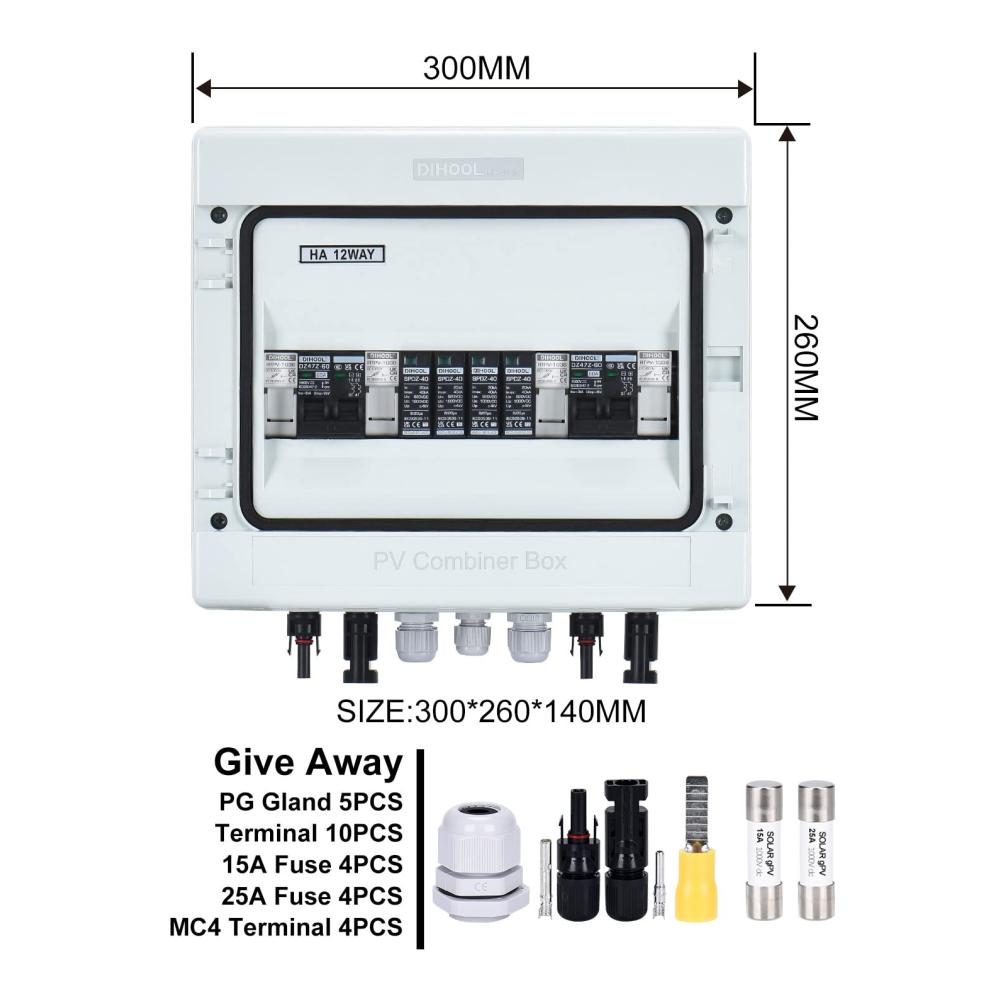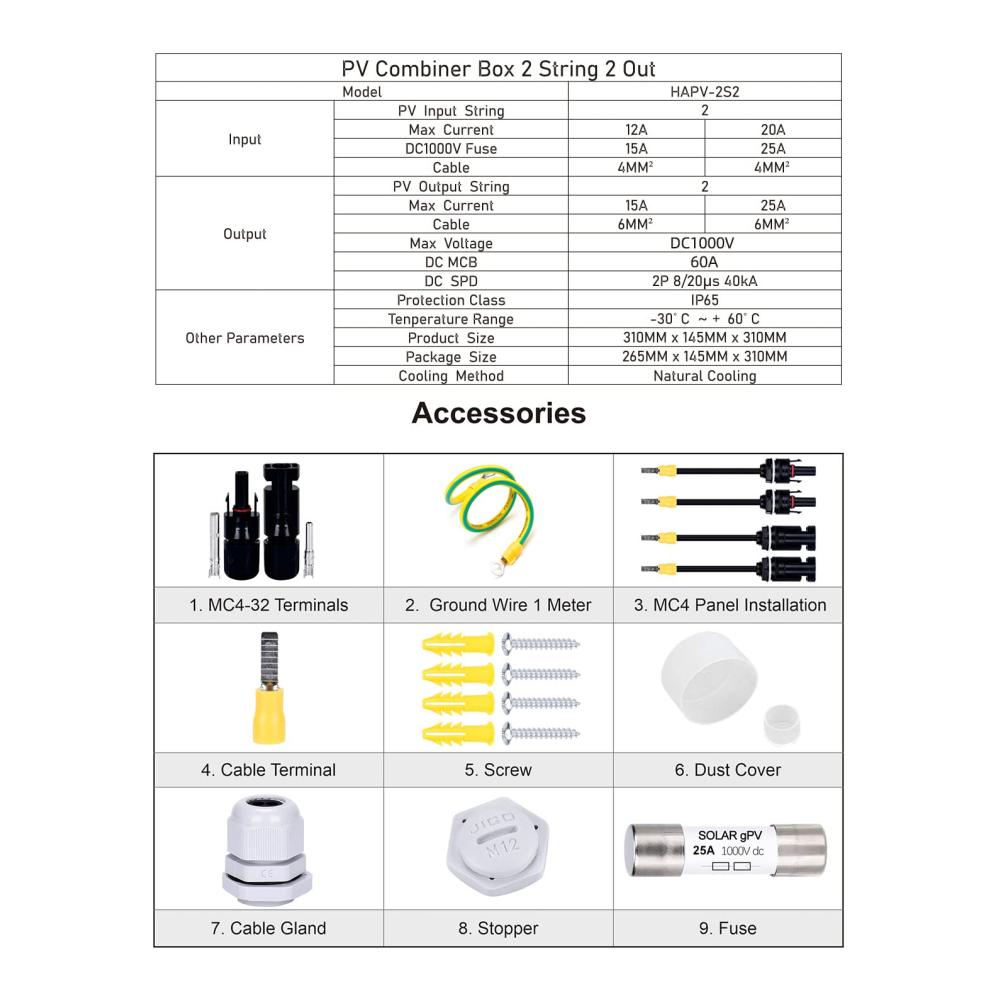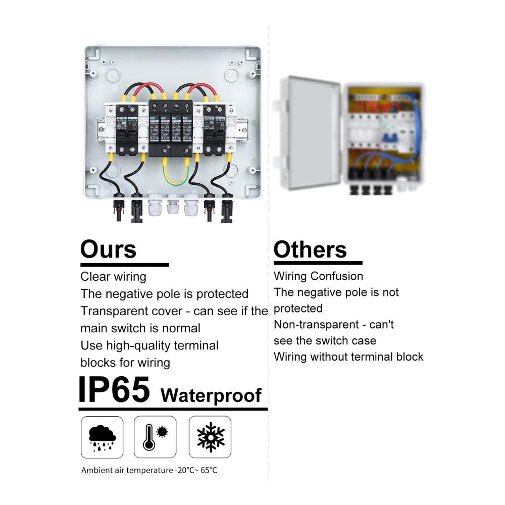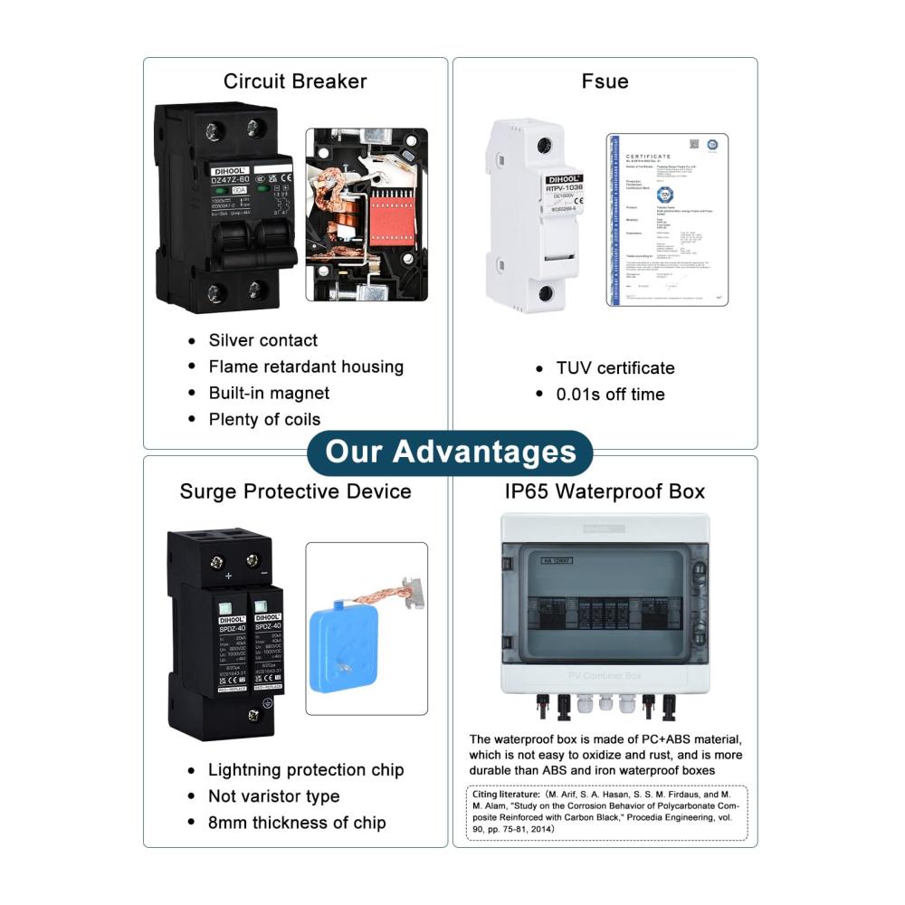 Sicherung:15A/25A,TÜV,CE-Zertifikate,IEC60269-6;Überspannungsschutz:20-40kA 2P DC1000V,Verwenden Sie Standard Blitzschutz-Chip anstelle von Piezoresistor;Leistungsschalter:60A DC1000V 2-pilog,Silberkontakt,Flammhemmende Schale,Ausreichend Kupferspule; Gehäuse: IP65,PC Material PC-Materialien haben eine ausgezeichnete Korrosionsbeständigkeit und eignen sich besser für die Herstellung von Komponenten, die in rauen Umgebungen arbeiten als Eisen.
