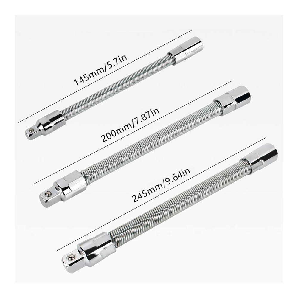 Das 3-teilige flexible Stecknuss-Verlängerungsstangen-Set, bestehend aus 1/2 Zoll, 1/4 Zoll und 3/8 Zoll Drehschlüssel-Federverlängerungen mit der Bezeichnung TTYCG-01, ist ein unverzichtbares Werkzeug für jeden Heimwerker oder Profi-Mechaniker.