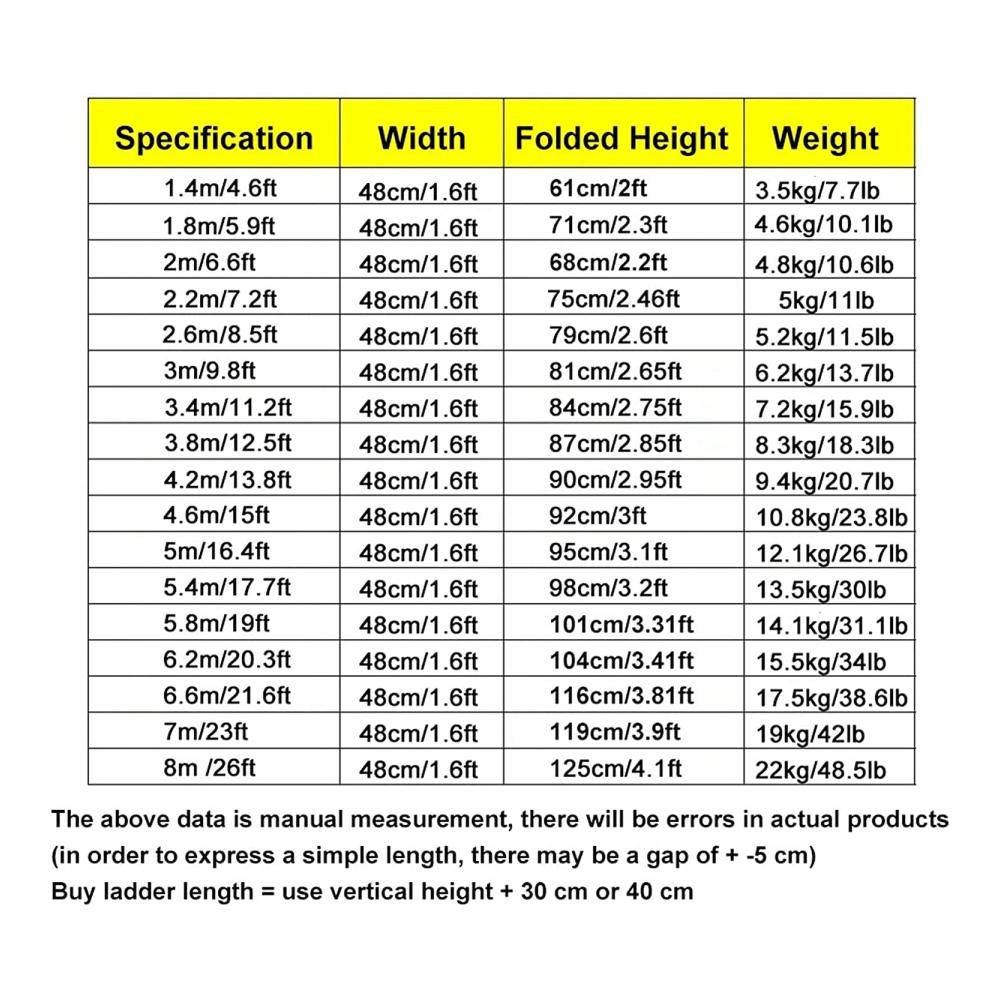 – Dies ist unsere neue Mehrzweck-Faltleiter. Unsere Leitern sind leicht, tragbar und für eine Vielzahl von inländischen und kommerziellen Anwendungen geeignet. Die Verwendung einer solchen Art von Tools ist bereits sehr beliebt DIY. Projekte, Trades, was auch immer Garten oder Workshop. – Spezifikation Material: Aluminiumlegierung Entfaltete Größe: (optiol) 1.4m / 4,6ft, 1,8 m / 59ft, 2m / 6.6ft, 2,2 m / 7.2ft, 2,6 m / 8.5ft, 3m / 9.8ft, 3,4 m / 11.2ft, 3,8m / 12.5 ft, 4,2 m / 13,8ft, 4,6 m / 15ft, 5m / 16,4ft, 5,4 mt / 17.7ft, 5,8m / 19ft, 6,2 m / 20,3ft, 6,6 m / 21,6ft, 7m / 23ft, 8m / 26ft Maximales Benutzergewicht: 150kg / 330LB – Meist gefällt Merkmale: Sowohl für individuelle als auch für den professionellen Gebrauch Dauerhaft und rostfrei, es ist das Geld wert – Technische Eigenschaften: Sparen Sie Platz: passt leicht in Schränke, die Rückseite eines Transporters oder des Kofferraums eines Autos. Leicht und leicht tragbar. Diese praktische und zuverlässige Leiter wird sein Gewicht in Gold wert, wenn Sie eine Vielzahl von Aufgaben in und außerhalb des Hauses angehen; nicht mehr kämpfen mit unbeholfene lange Verlängerungsleitern. Ideal für den Loft-Zugang, Fensterreinigung, Rinnenreinigung, Innen- und Außenmalerei, allgemeines Dekorieren, Zugriff auf Schränke, Wartungsaufgaben und mehr! Dank der ausziehbaren Design des Ladders können Sie sicher in kleinere engere Räume eingehen, die eine größere Leiter nicht zulassen würde. – Bitte beachten Sie: Legen Sie Ihre Hände oder Finger beim Schließen der Leiter nicht zwischen der Sprosse. – Packungsinhalt: 1 x Teleskopleiter Hinweis: 1. Wegen des manuellen Maßes 1-3cm Größenfehler, nehmen Sie körperliche Größe muss vorherrschen. 2. Es gibt einen kleinen Unterschied zwischen dem Bild und dem tatsächlichen Element, das durch die Helligkeit verursacht wird. 3. Ein falscher Wartungsmodus wird das Erscheinungsbild de