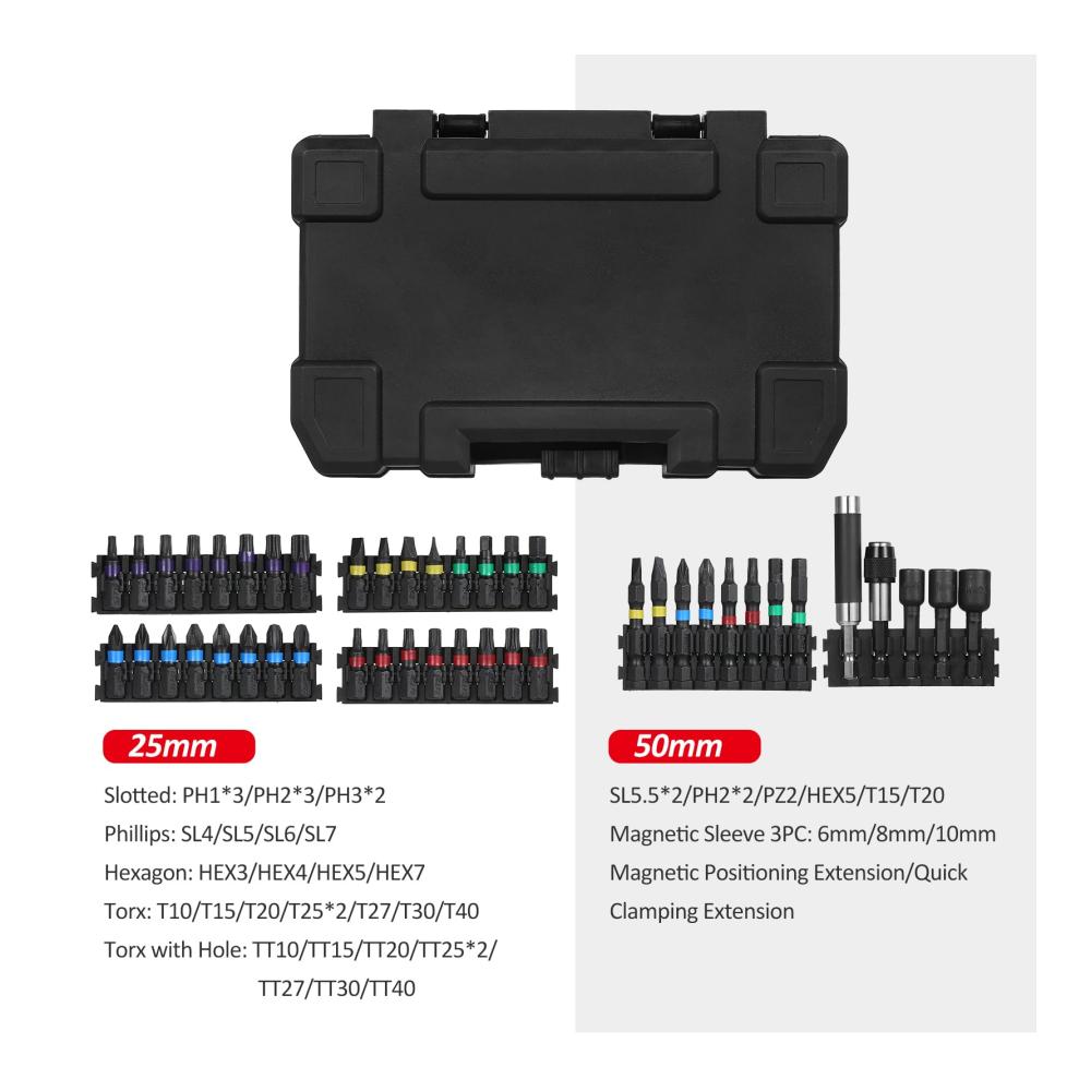 Herzlich willkommen bei unserem exklusiven 45-teiligen Bohrer- und Schraubendreher-Bit-Set – die ultimative Lösung für Ihre DIY-Projekte! Unser umfangreiches Sortiment bietet Ihnen Vielseitigkeit und Qualität für Arbeiten an Holz, Metall, Stahl und mehr. Dieses Schlagschrauber-Bit-Set wurde sorgfältig zusammengestellt, um alle Anforderungen Ihrer Elektrowerkzeuge zu erfüllen.