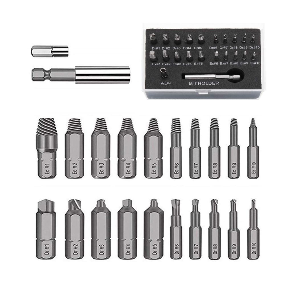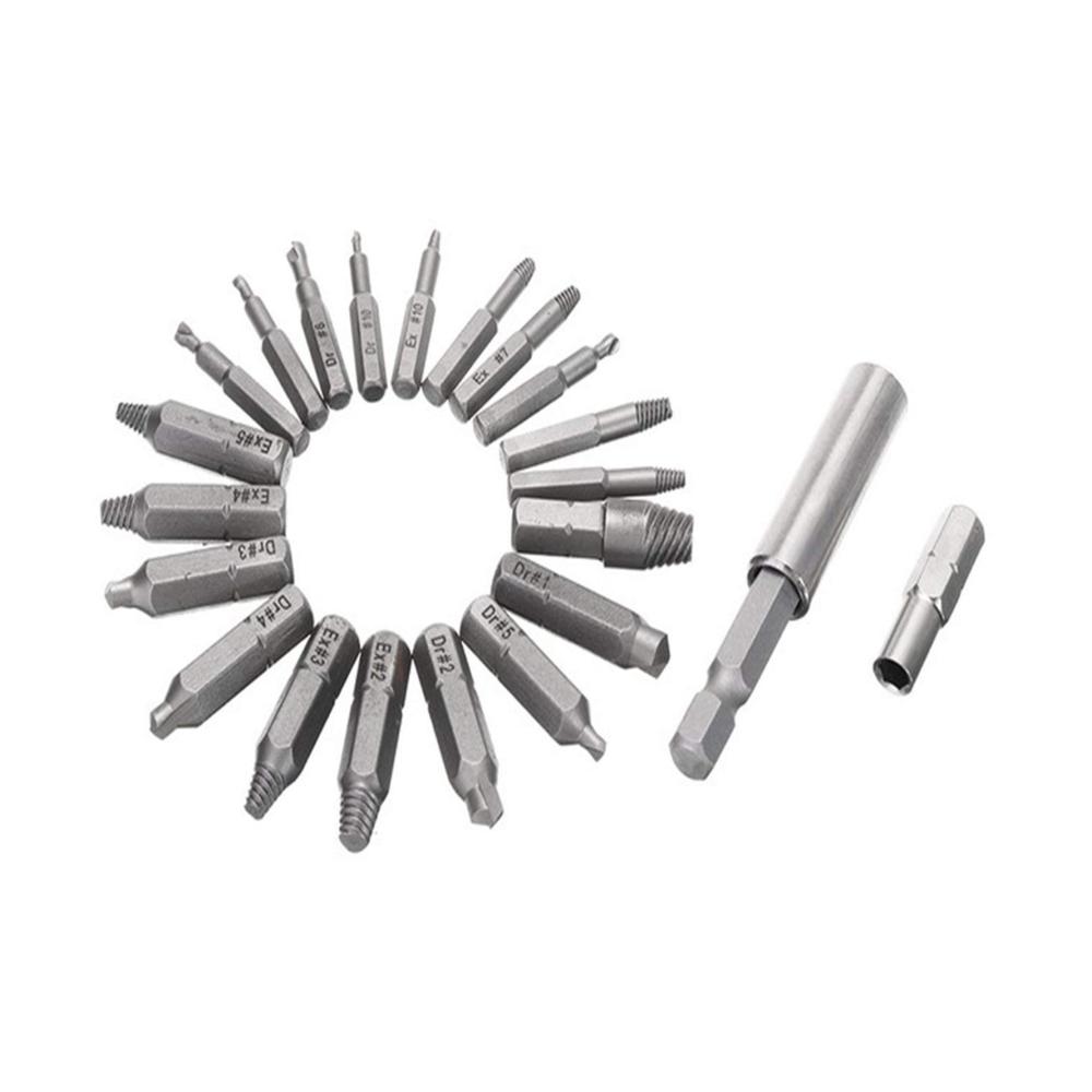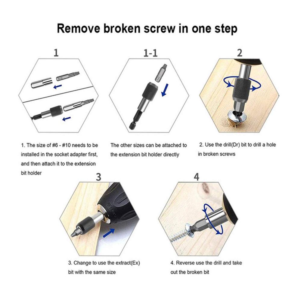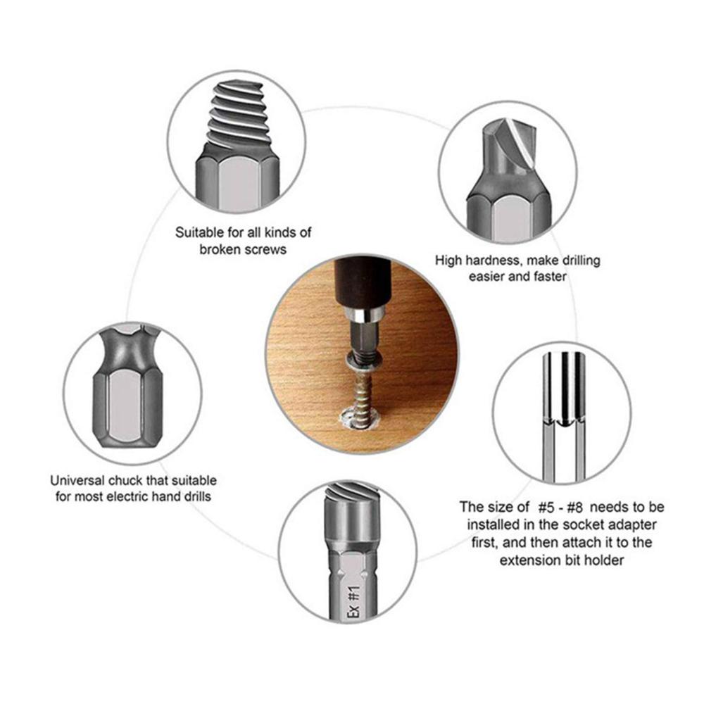 Praktisch: Die Schraubenausdreher mit zwei Verlängerungs-Bithalter können in einem Schritt entfernt werden und müssen nicht den Ausdreher umwandeln oder das Bohrfutter einstellen. Universalfutter, das für die meisten elektrischen Handbohrmaschinen geeignet ist.
