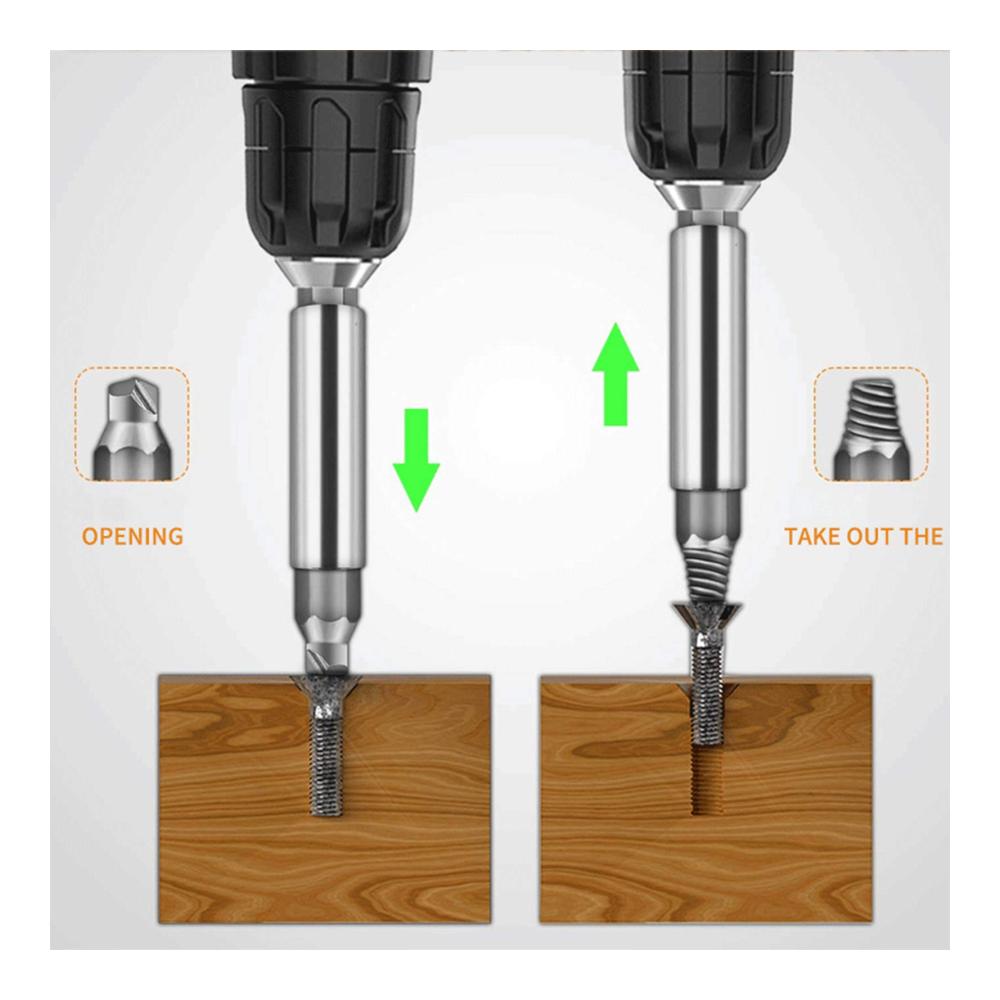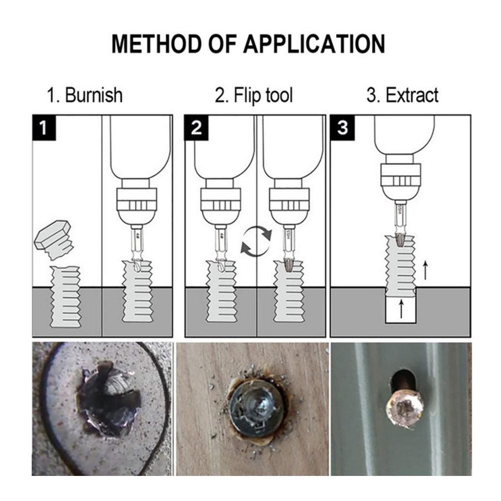 Einfach zu bedienen: Sie brauchen nur zwei Schritte und Sie werden die Arbeit fertigstellen. Verwenden Sie einen geeigneten Schraubenentferner des Bolzenausdreher-Sets, um ein Loch mit der Schnittgröße zu bohren, und dann die Schraube oder den Bolzen mit dem Ausdreherwerkzeug zu entfernen.