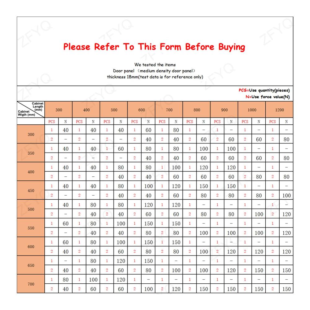 1: Wenn die Größe „N“ zu klein ist, fällt der Küchenschrank herunter und schließt sich sofort; wenn die Größe „N“ zu groß ist, lässt sich der Küchenschrank nicht schließen. Folgen Sie also bitte der Referenztabelle, um die richtige Größe zu wählen.