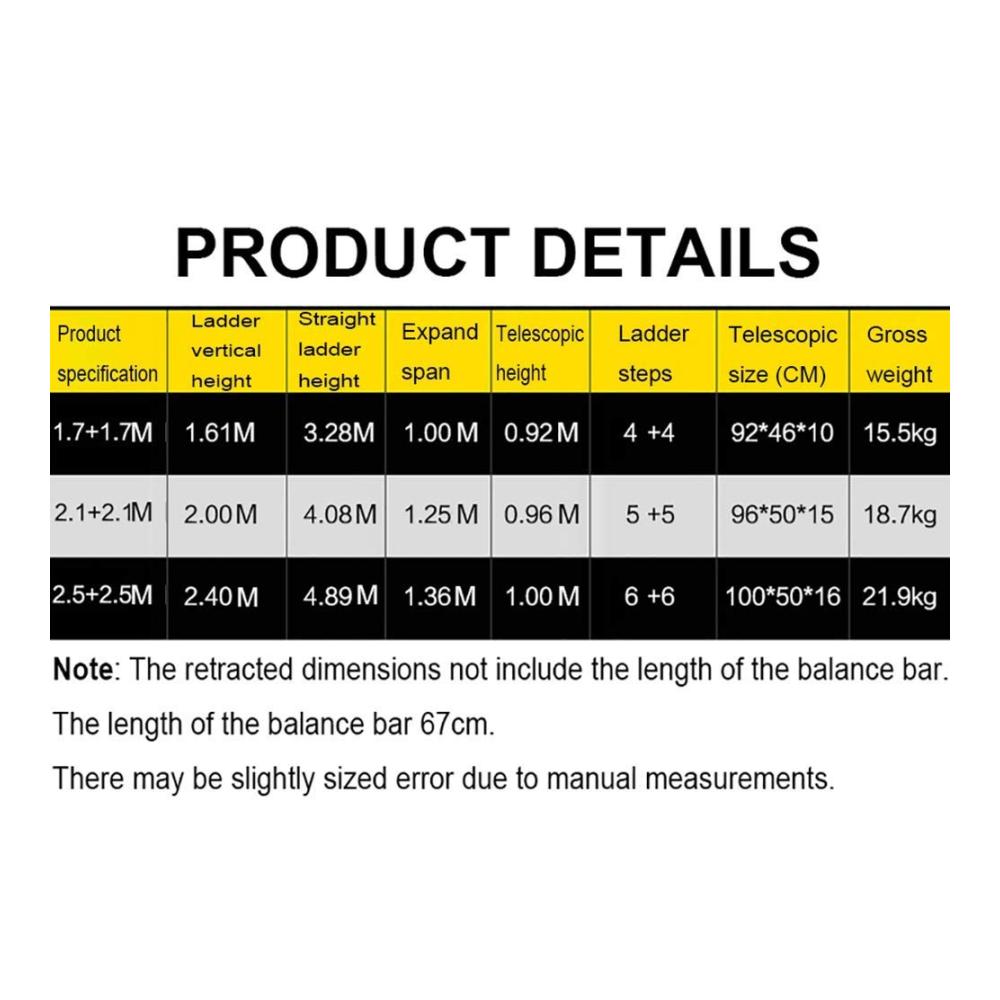 Die Teleskopleiter ist auf Mobilität ausgerichtet und lässt sich leicht zusammenfalten, um sie bequem zu transportieren und platzsparend zu lagern. Mit einem beeindruckenden 1 Meter / 82,7 Fuß Höhe bietet sie die erforderliche Reichweite für verschiedene Bauzubehörprojekte. Das Hochleistungsrad gewährleistet eine mühelose Bewegung, sodass Sie sich frei auf der Baustelle bewegen können.