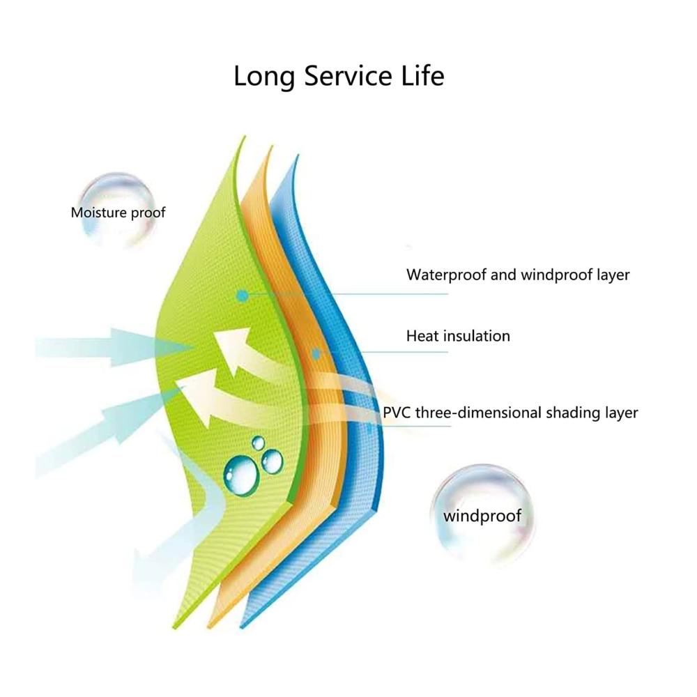 Wasserdichtes Material: Dicke 0,5 mm, transparentes Rollo aus PVC-Material, beständig gegen hohe und niedrige Temperaturen, Reißfestigkeit. weiche Textur, nicht leicht zu vergilben, gute Lichtdurchlässigkeit, nicht porös, staubdicht und gute Wärmeschutzwirkung.