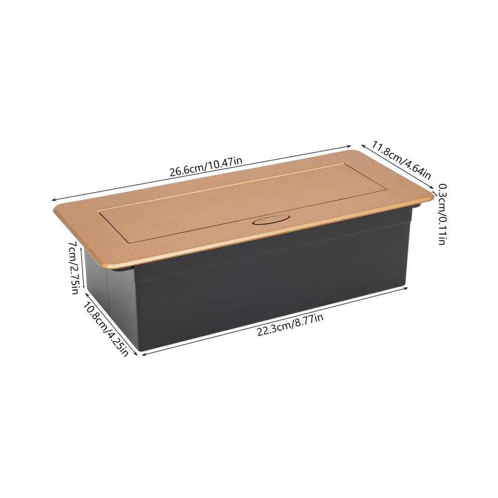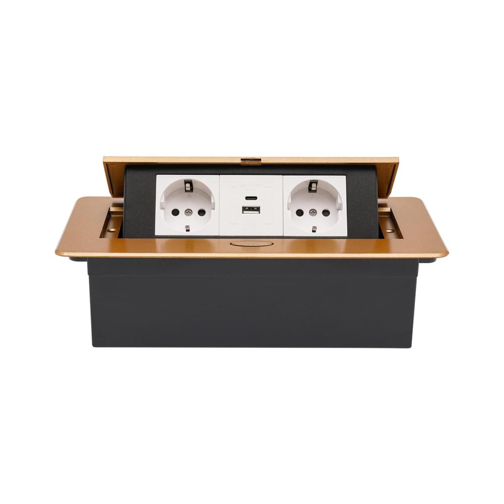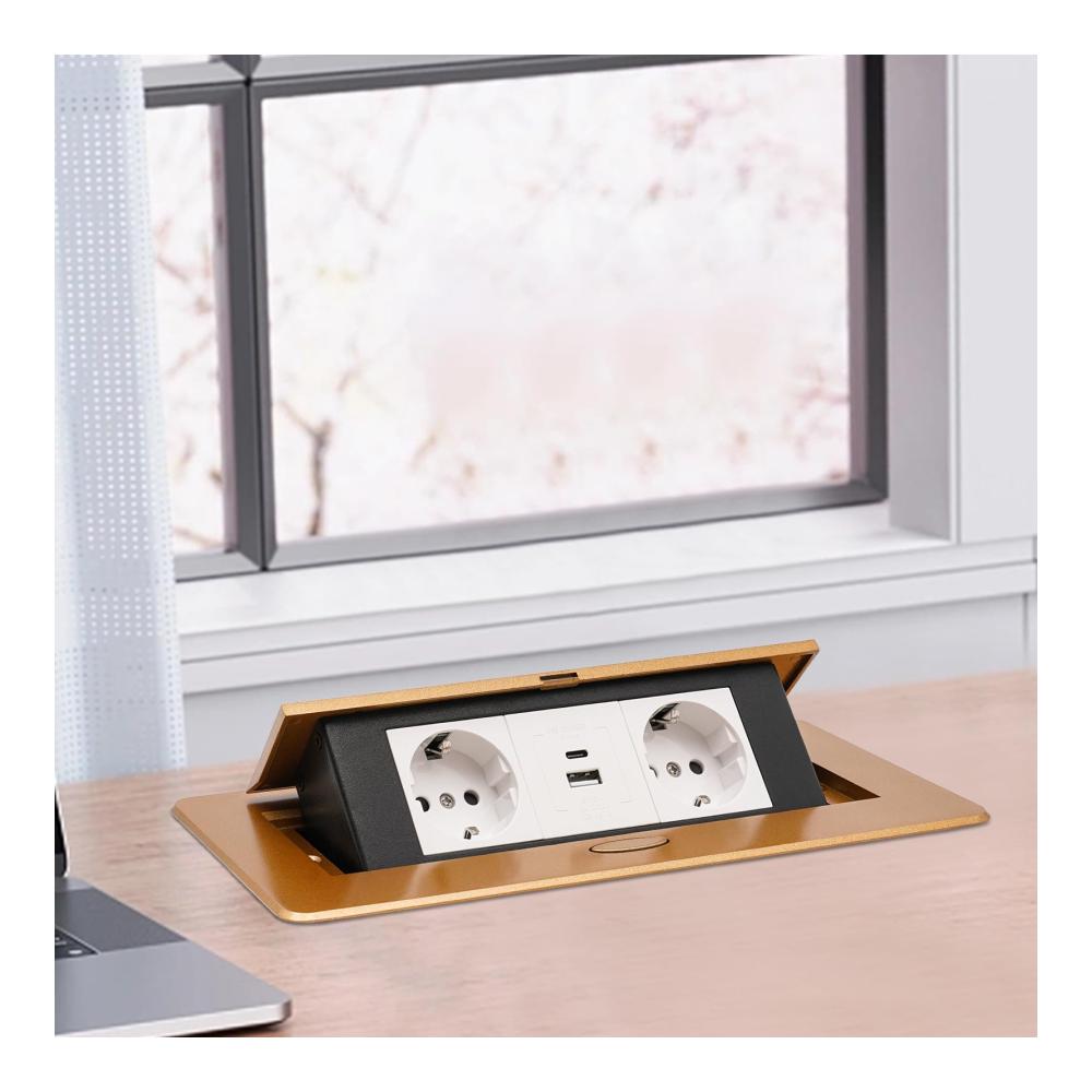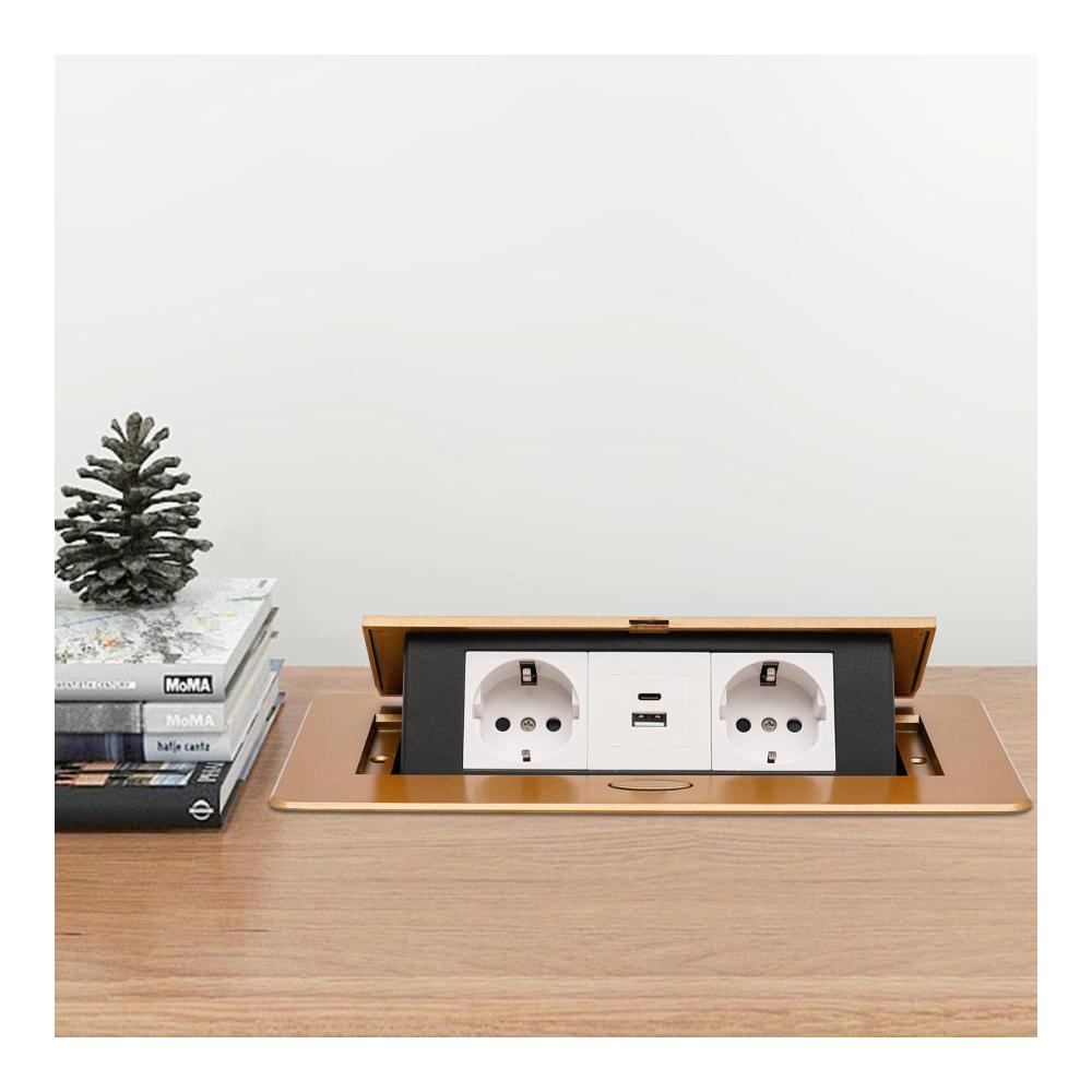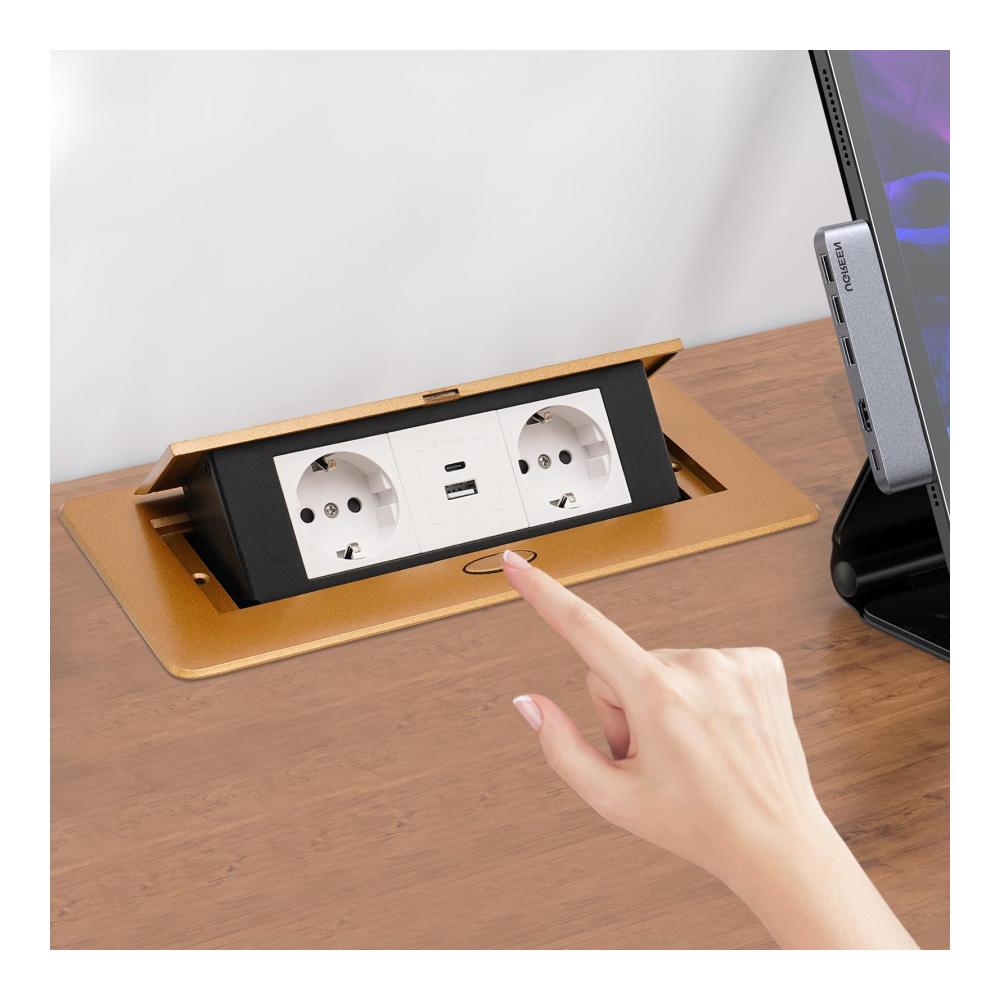 Unsere versenkbare Einbausteckdose kombiniert Funktionalität und Ästhetik. Mit 250V Spannung und USB Type C Schnelllademöglichkeit ist sie ideal für den modernen Arbeitsplatz. Der goldene Farbton verleiht Ihrem Schreibtisch eine luxuriöse Note. Durch das innovative Pop-Up-Design bleibt die Steckdose bei Bedarf unsichtbar und spart somit wertvollen Platz.