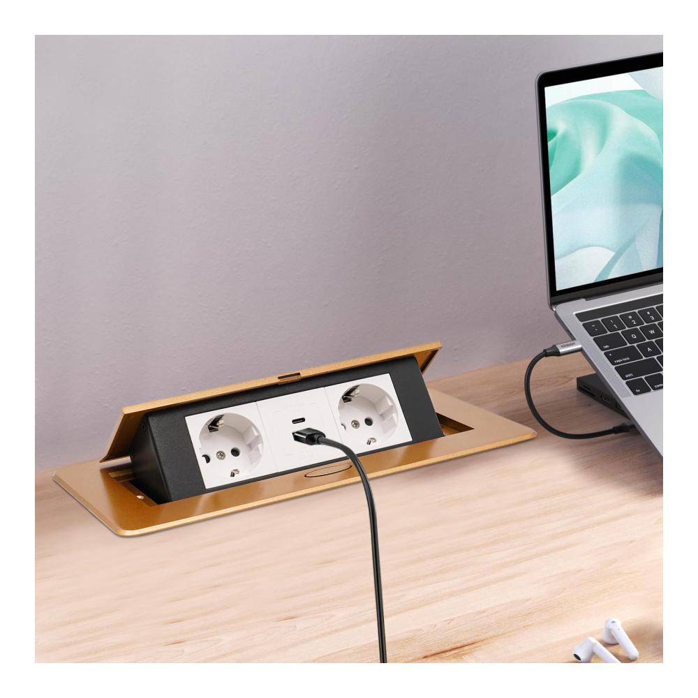 Sie suchen nach einer eleganten und platzsparenden Lösung für die Stromversorgung an Ihrem Schreibtisch? Unsere versenkbare Einbau Steckdose ist die perfekte Antwort auf Ihre Bedürfnisse. Entwickelt für Arbeitsplatten im Büro, bietet diese innovative Tischsteckdose nicht nur eine praktische Stromquelle, sondern auch eine schnelle USB Type C Schnellladefunktion.