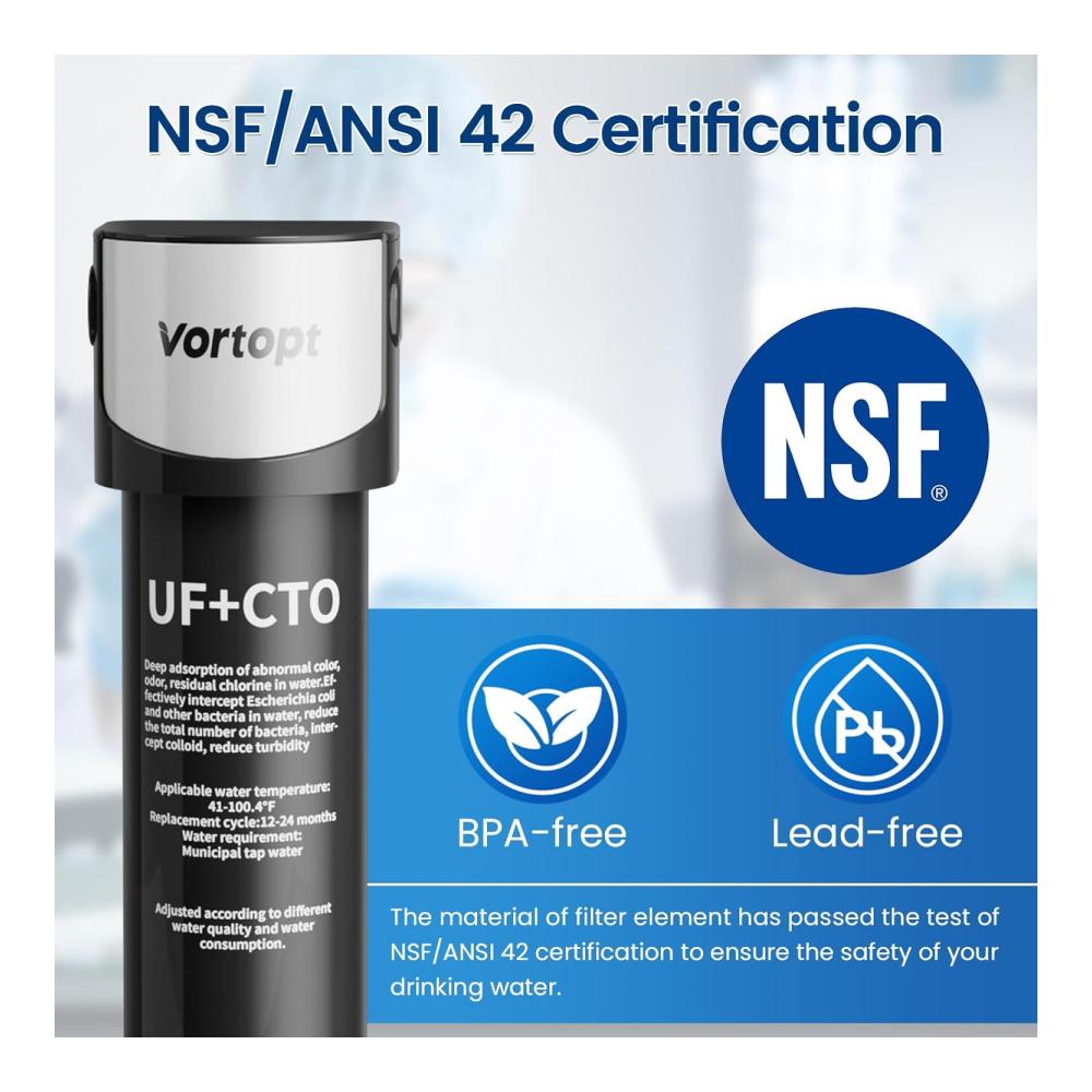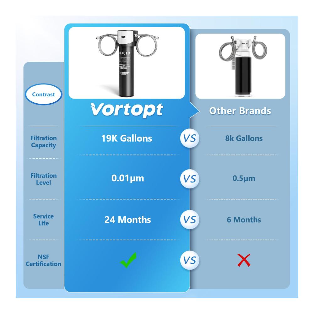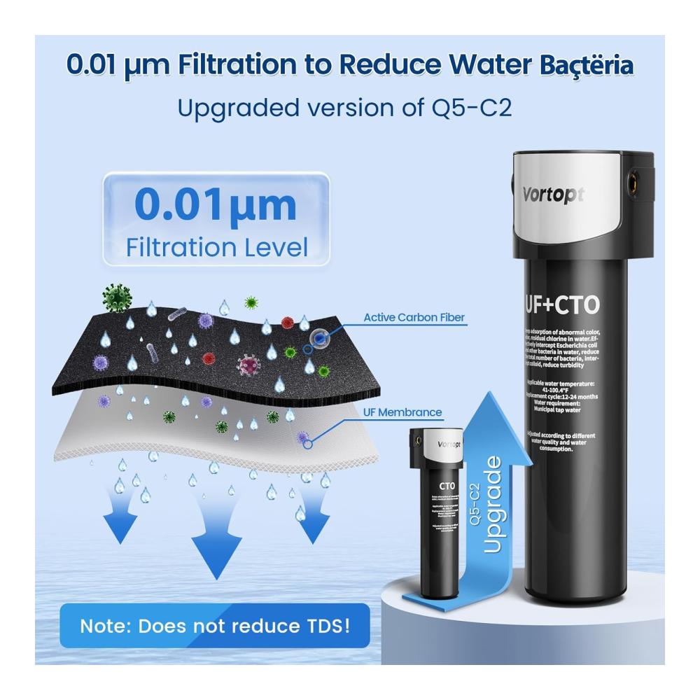 𝟎,𝟎𝟏 μ𝐦 𝐅𝐢𝐥𝐭𝐫𝐚𝐭𝐢𝐨𝐧𝐬𝐠𝐞𝐧𝐚𝐮𝐢𝐠𝐤𝐞𝐢𝐭: Hergestellt aus Aktivkohlefaser und UF-Membran kann das Vortopt Untertisch-Wasserfiltersystem effektiv abnormale Farbe und Geruch adsorbieren und Verunreinigungen wie Chlor, Blei, Sedimente und andere Partikel mit einer Größe von mehr als 0,01 μm entfernen. Verabschieden Sie sich von Flaschenwasser und genießen Sie gesundes, reines Wasser direkt aus Ihrem Wasserhahn!(Ersatzfilter sind käuflich zu erwerben, suchen Sie nach ASINs: B0CDLTJ67Z)