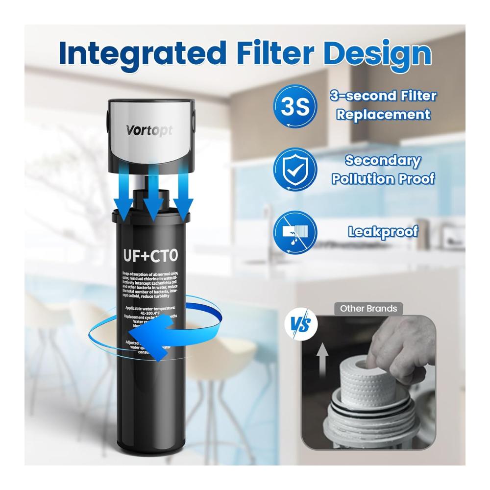 𝐄𝐫𝐰𝐞𝐢𝐭𝐞𝐫𝐭𝐞𝐬 𝐅𝐢𝐥𝐭𝐞𝐫𝐝𝐞𝐬𝐢𝐠𝐧: Das integrierte Filterdesign dieses Untertisch-Wasserfilters spart Platz unter dem Waschbecken und sorgt für ein sauberes und aufgeräumtes Aussehen. Außerdem ermöglicht sein Dreh- und Verriegelungsdesign einen einfachen Filterwechsel ohne zusätzliche Werkzeuge oder komplizierte Schritte.
